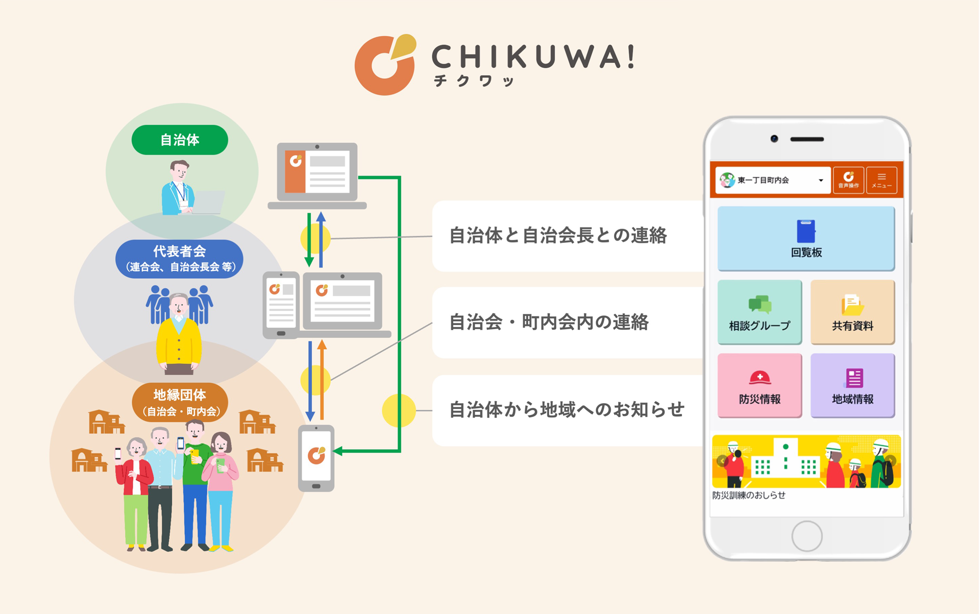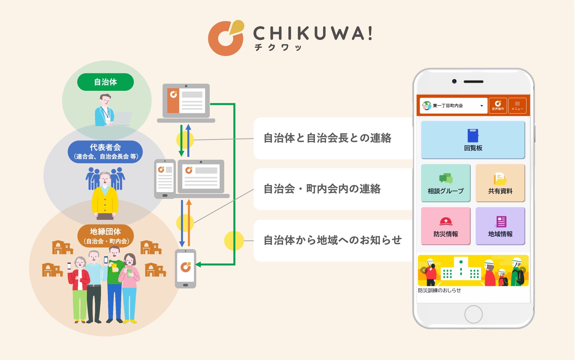 「CHIKUWA!」は、自治会・町内会運営のデジタル化を支援する連絡ツールとして、自治体と自治会・町内会間における情報共有をはじめ、電子回覧板やアンケート、グループ掲示板など、団体運営に必要な機能を提供してきました。
