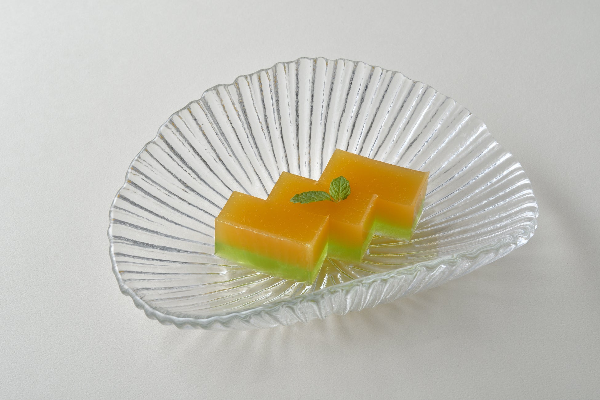 メロンのピューレを使い、ピンク&緑のツートンが美しいゼリー仕立てに。甘さ控えめで食後の口内もすっきり。
