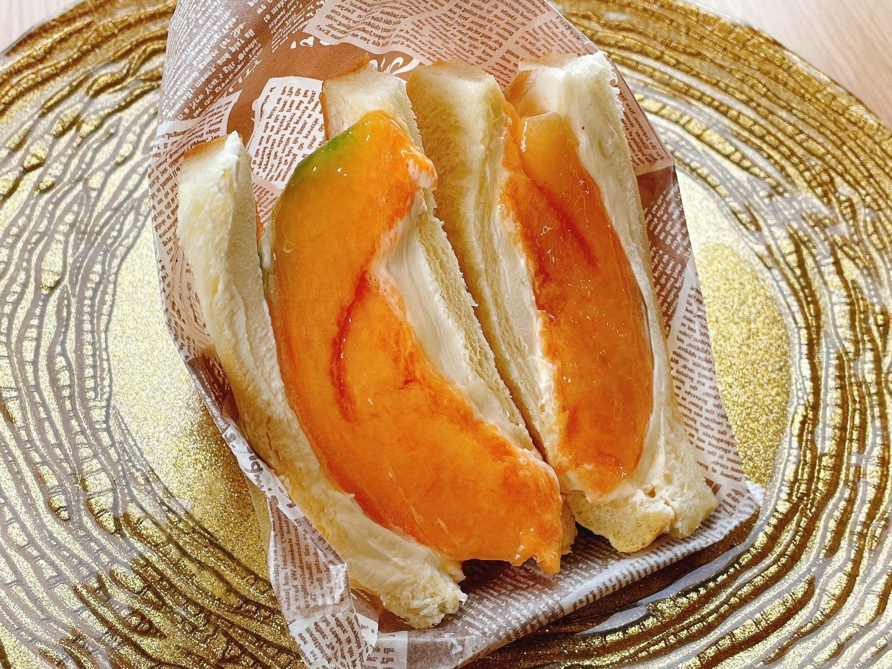 ジューシーなメロンを、たっぷりのマスカルポーネ入り生クリームと、ふわふわ食感の食パンでサンドした贅沢なフルーツサンド!