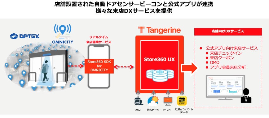 リアル店舗での来店施策及び来店・購買分析サービス「Store360」の提供を通し、小売店・飲食店などの販促業務の改善をDXの力で解決するTangerine株式会社(東京都港区 代表取締役:平井 清人、以下「当社」)は、自動ドアセンサー最大手のオプテックス株式会社(本社:滋賀県大津市、代表取締役社長:上村 透、以下「オプテックス」)が運営するビーコンを内蔵した自動ドアセンサーによる情報発信メディアプラットフォーム「OMNICITY」と連携し、リアル店舗での来店時の様々な販促・DX施策や来店履歴データ取得サービスを簡単に構築できる「Store360 SDK for OMNICITY」の提供を開始しました。