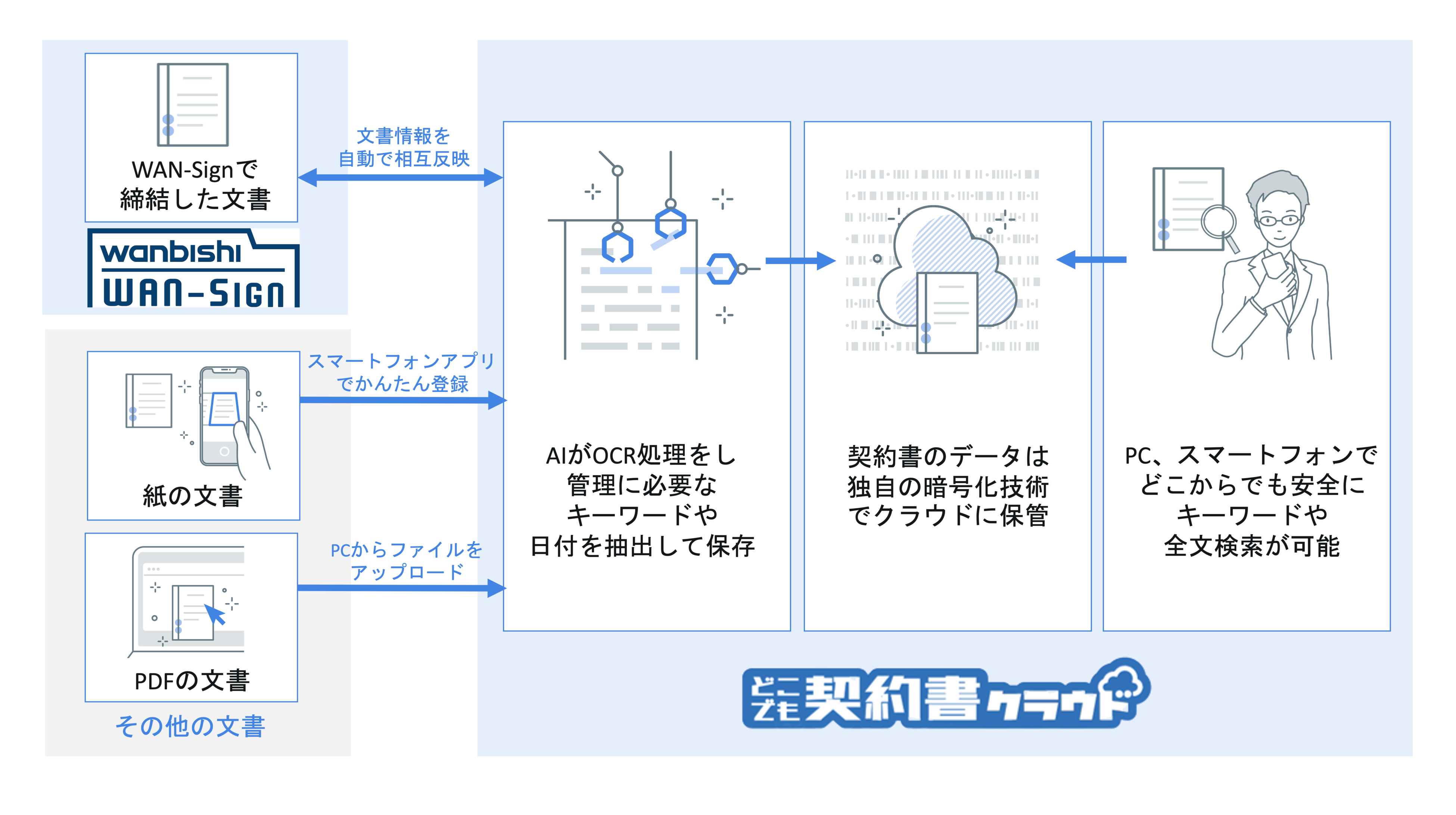 このような課題を解決するため、「どこでも契約書クラウド」と「WAN-Sign」はAPIによるシステム連携を開始し、「WAN-Sign」で締結した契約書が自動的に「どこでも契約書クラウド」に保存できるようになりました。従来の紙の契約書はアプリで撮影するだけ、PDFはドラッグ&ドロップするだけで、紙の契約書も電子契約書も「どこでも契約書クラウド」で一元化して保管が可能となります。取り込んだ契約書はAI-OCRで処理され、全文検索することができます。