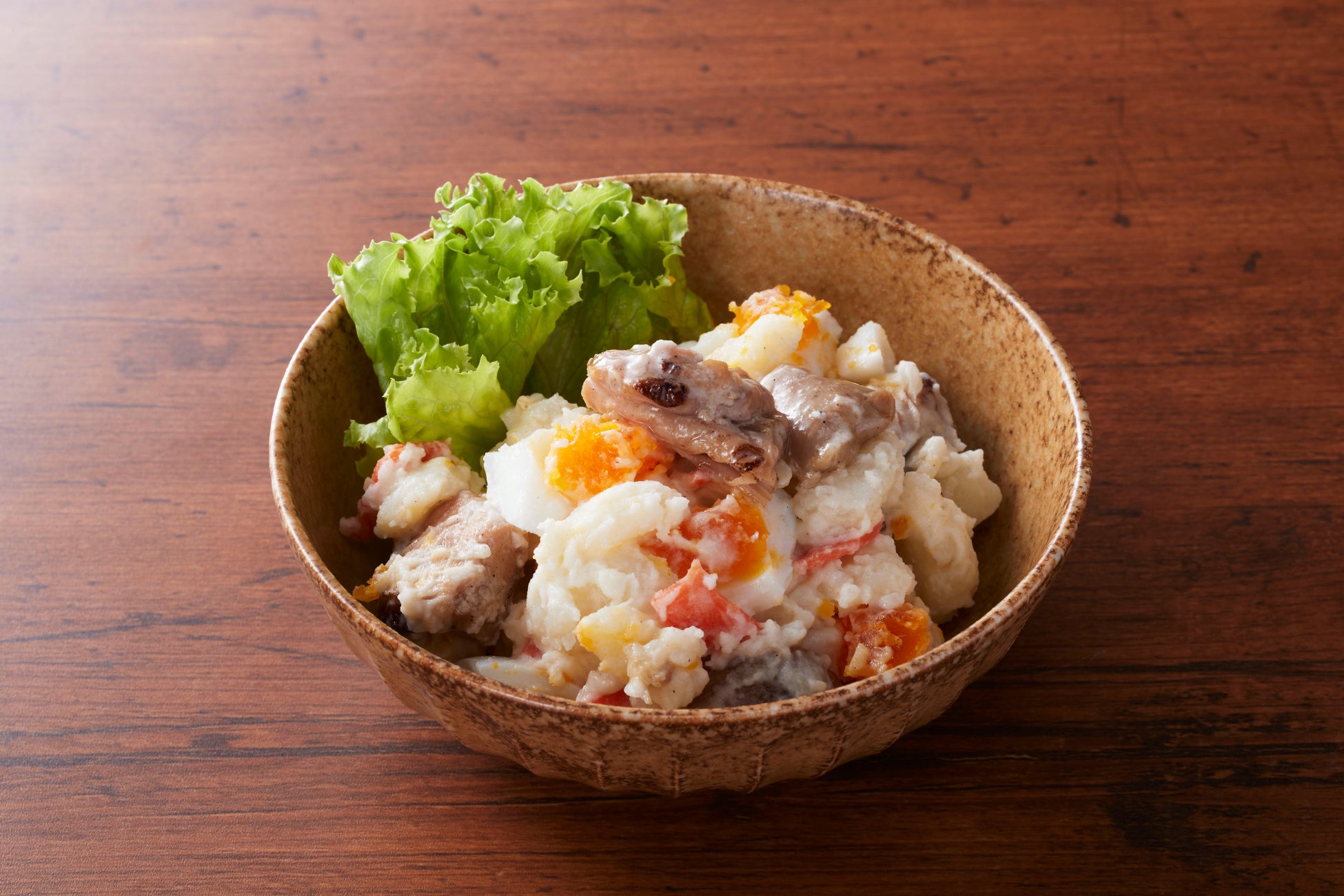 旨塩味は、親子ポテトサラダです。ポテトサラダとゆで卵1個を潰しながら混ぜるだけで簡単におつまみにピッタリなお惣菜ができます。