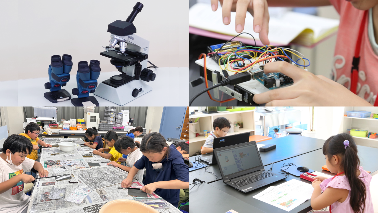 本格的な器具を有している理科実験教室、プログラミング教室が母体だからこそ使用できる、実験道具、モノづくり・電子工作ツール、プログラミング教材など、お子さまのやってみたいという気持ちを刺激する道具で溢れています。