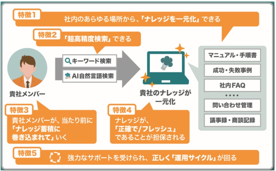 非IT企業の方が、一切迷わず「ナレッジの集約」「高精度検索」することができます。更に、最新の「生成AI機能」が実装され、「ナレッジ蓄積に巻き込まれていく仕組み」「ナレッジが、”正確”で”フレッシュ”であることが担保される仕組み」が搭載されていることが『ナレカン』の大きな特徴です。