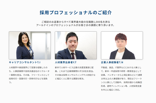 弊社に所属する人材のプロフェッショナルをご紹介しています。採用代行させていただく際の実務はキャリアコンサルタント有資格者・人材業界出身者・企業人事経験者などからなるプロフェッショナルが担当します。