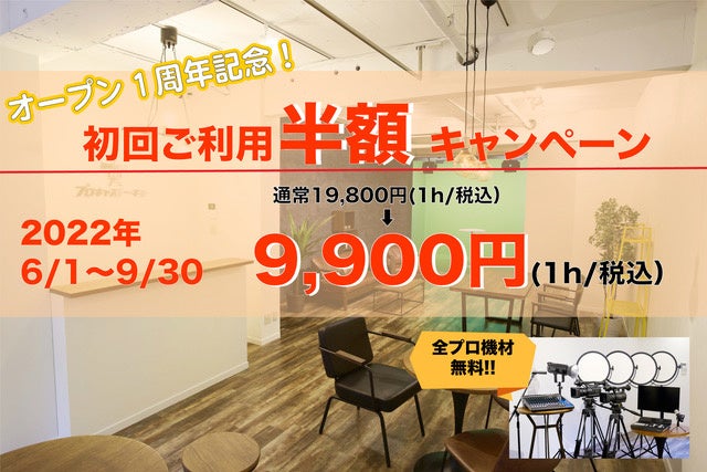1周年記念キャンペーン 第一弾 初回ご利用スタジオ料金半額 6月1日から9月30日ご利用分まで