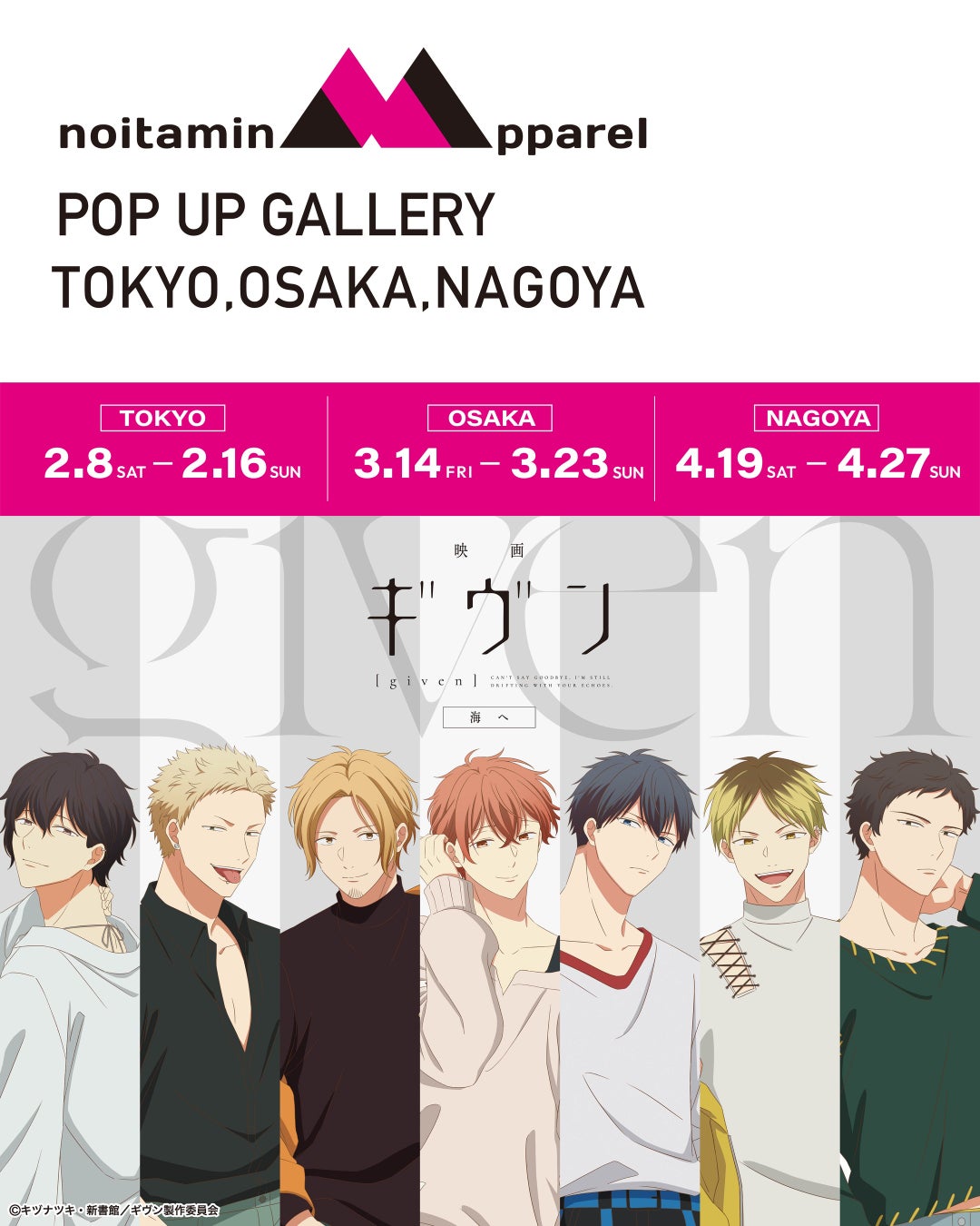 フジテレビ深夜アニメ枠“ノイタミナ”から生まれたアパレルブランド「ノイタミナアパレル」を運営するバナナスピリッツ株式会社(本社:東京都港区 代表取締役:米山博)は、 “ノイタミナ”作品のアパレル雑貨を中心としたECサイトと連携するリアル店舗(ノイタミナアパレル POP UP ギャラリー)を、アニメ『ギヴン』シリーズをフィーチャーしたかたちで、東京・大阪・名古屋の3ヶ所を巡回開催いたします。