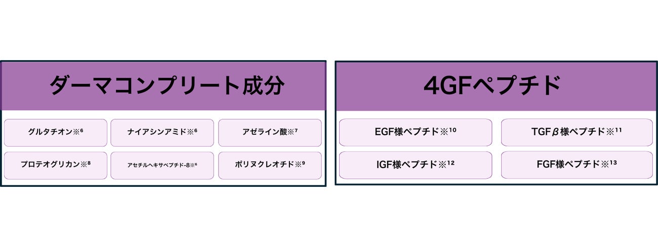 美容テクノロジーから着想を得た「ダーマコンプリート成分」(グルタチオン※⁶ ナイアシンアミド※⁶ アゼライン酸※⁷ プロテオグリカン※⁸ アセチルヘキサペプチド-8※⁶ ポリヌクレオチド※⁹)とぷるんとハリツヤ肌に整える「4GFペプチド」(EGF様ペプチド※¹⁰、TGFβ様ペプチド※¹¹、IGF様ペプチド※¹²、FGF様ペプチド※¹³)を配合し、悩み深い大人の弾力感・透明感※³・エイジングケア※²にアプローチします。