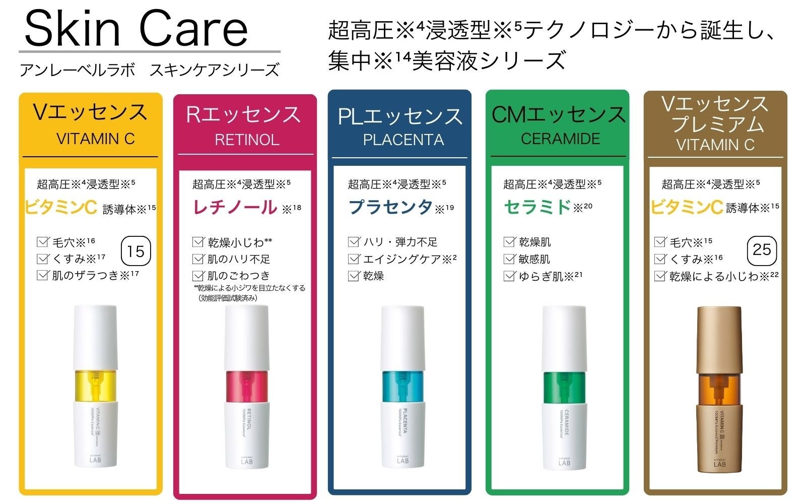 ※1アンレーベルラボにおいて ※2年齢に応じたケア ※3うるおいを与えることで健やかに見える印象 ※4超高圧加工処理装置を用いた原料 ※5角質層まで ※6保湿成分 ※7アゼロイルジグリシンK(保湿成分) ※8水溶性プロテオグリカン(保湿成分)※9DNA-K(保湿成分) ※10オリゴペプチド-24(保湿成分) ※11オリゴペプチド-34(保湿成分) ※12オリゴペプチド-20(保湿成分) ※13アセチルデカペプチド-3(保湿成分) ※14気になる部分に集中的に使用 ※15超高圧処理したテトラヘキシルデカン酸アスコルビル(保湿成分) ※16肌にうるおいを与え、乾燥により目立った毛穴を目立たなくすること ※17乾燥してキメが乱れた肌印象のこと ※18超高圧処理した水添レチノール(エモリエント) ※19超高圧処理したプラセンタエキス (保湿成分) ※20超高圧処理したスフィンゴ糖脂質(保湿成分)※21季節の変わり目や外部環境の変化により一時的に敏感になりやすい肌のこと ※22乾燥による小ジワを目ただなくすること *超高圧処理したヒト脂肪由来間葉系細胞エクソソーム(保湿成分) **乾燥による小ジワを目立たなくする(効能評価試験済み)