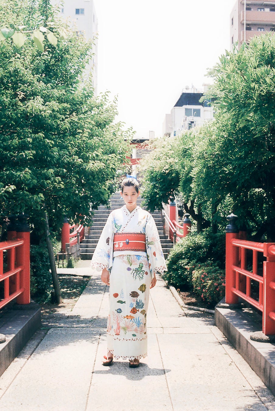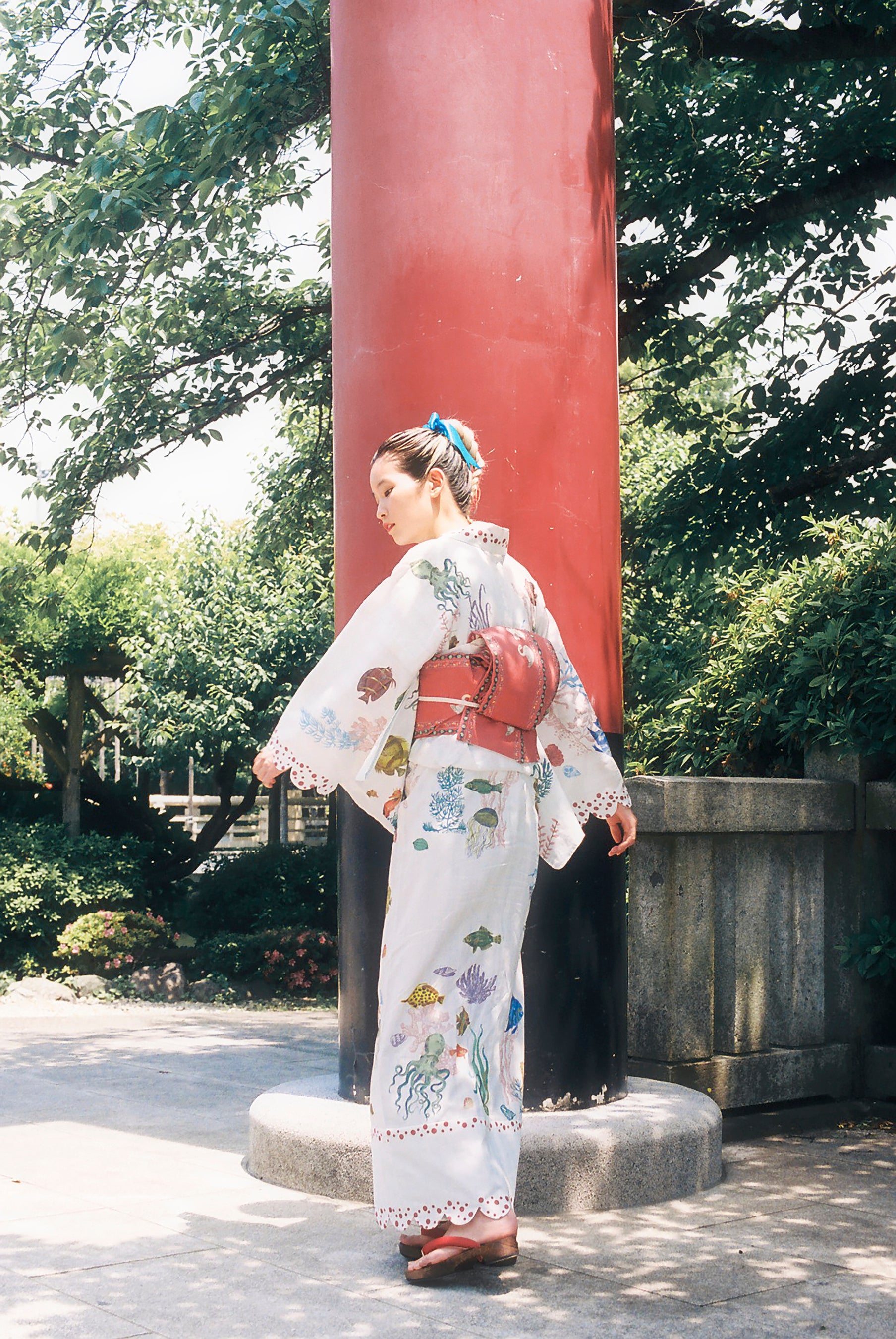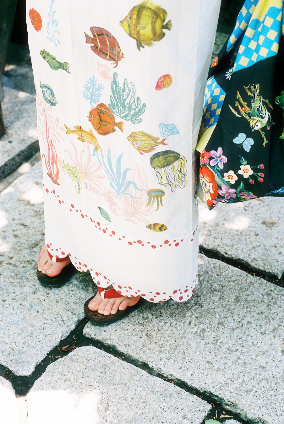 オーガニックコットン糸を使用したスッキリと爽やかな白地のゆかたに、お魚たちが泳いでいます。彩る赤の水玉は、水中の水の泡をイメージしています。カラフルで可愛らしい印象は与えつつ、大人っぽさと抜け感を感じられる一枚です。一匹一匹ナタリー氏が描いたお魚たちはどれも個性的。ぜひ自分のお気に入りの魚を探してみてください。