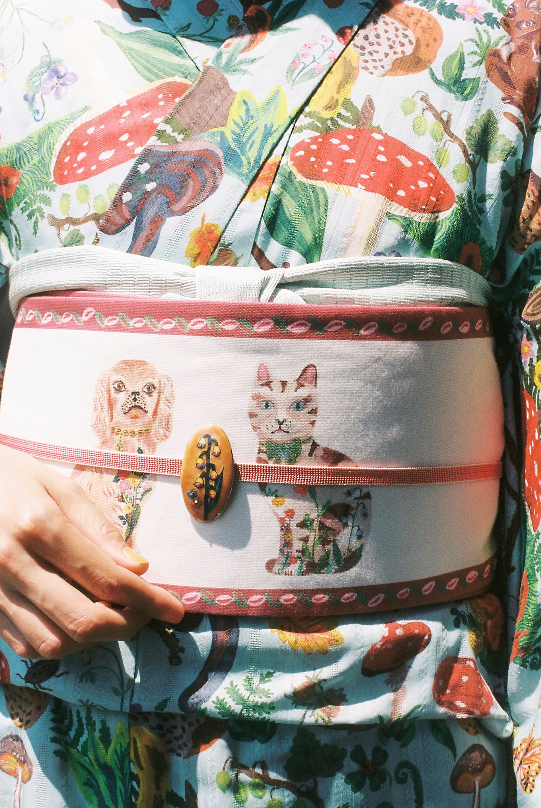 いぬとねこの半巾帯(裏面) 22,000円(税込)・ 七宝焼き帯留 8,800円(税込)