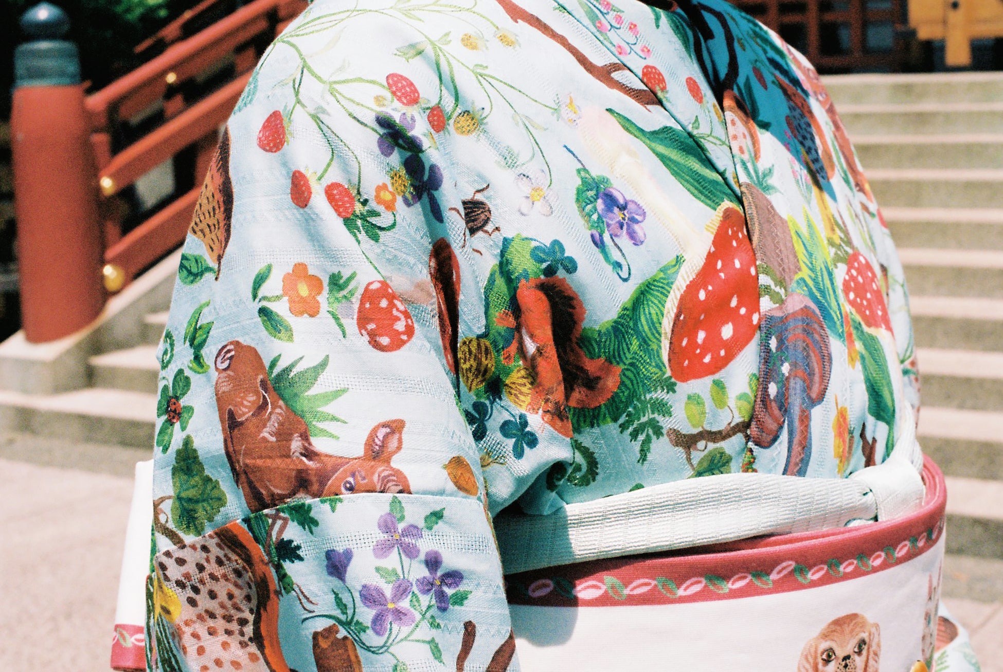 裾と袖一面に広がるお花や果物、蝶々が目を引く羽織は、海外の方々にもきものを楽しんでいただける懸け橋のような存在になればという想いが込められたアイテム。生地にはきもの地としても人気な片貝木綿を使用しています。カーディガンのように、洋服の上からさらっと羽織っていただくスタイルもおすすめです。