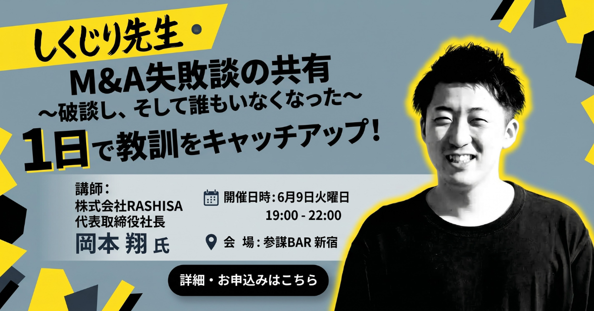 経営者コミュニティ「参謀」を運営する株式会社経営参謀(本社:東京都新宿区、代表取締役:新谷 健司)は、2026年6月9日(火)に「M&A失敗談の共有〜破談し、そして誰もいなくなった〜」をテーマとした勉強会を開催します。実際にM&A交渉の破談と従業員の大量離職を経験した株式会社RASHISA代表取締役社長の岡本翔氏を講師に迎え、事業譲渡を検討する経営者が陥りがちな「情報管理の甘さ」と「社内コミュニケーションのボタンの掛け違い」について、リアルな失敗体験に基づく教訓をお伝えします。