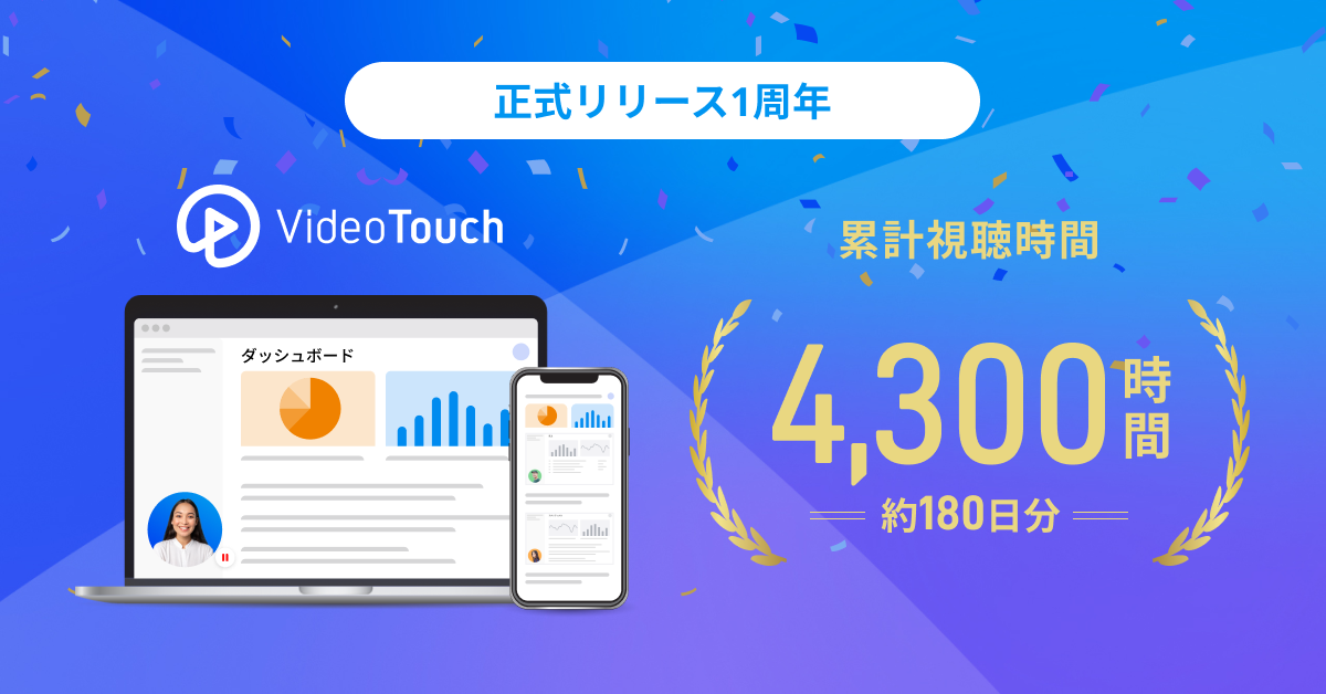 株式会社Viibar(本社:東京都渋谷区、代表取締役:上坂優太)は、運営するトレーニングプラットフォーム「VideoTouch(ビデオタッチ)」が、2022年4月13日でリリース1周年を迎えたことをお知らせいたします。ビデオの累計視聴時間は「4,300時間(約180日分)」に到達いたしました。