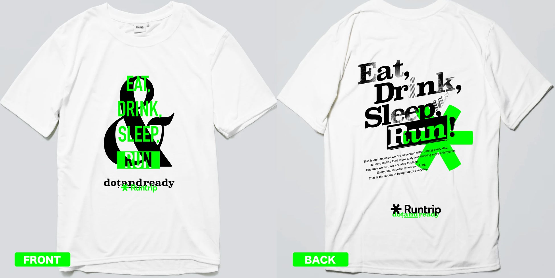 2020年のブランド誕生以来、Runtrip Storeを牽引する『EAT DRINK SLEEP RUN / STREET』シリーズから、2023年6月19日に初めて新タイプのブランドロゴTシャツが発売されました。その真新しいロゴTシャツをベースに、6月30日に誕生した『dotandready [wear]』とのコラボTシャツを、7月13日(木)にリリース致しました。「蛍光グリーン」がキーカラーとなったこのアイテムは『. AND READY』で展開するPOP-UPを記念して販売するモデルで、POP-UPを訪れた人しか買えない完全限定アイテムとなります。