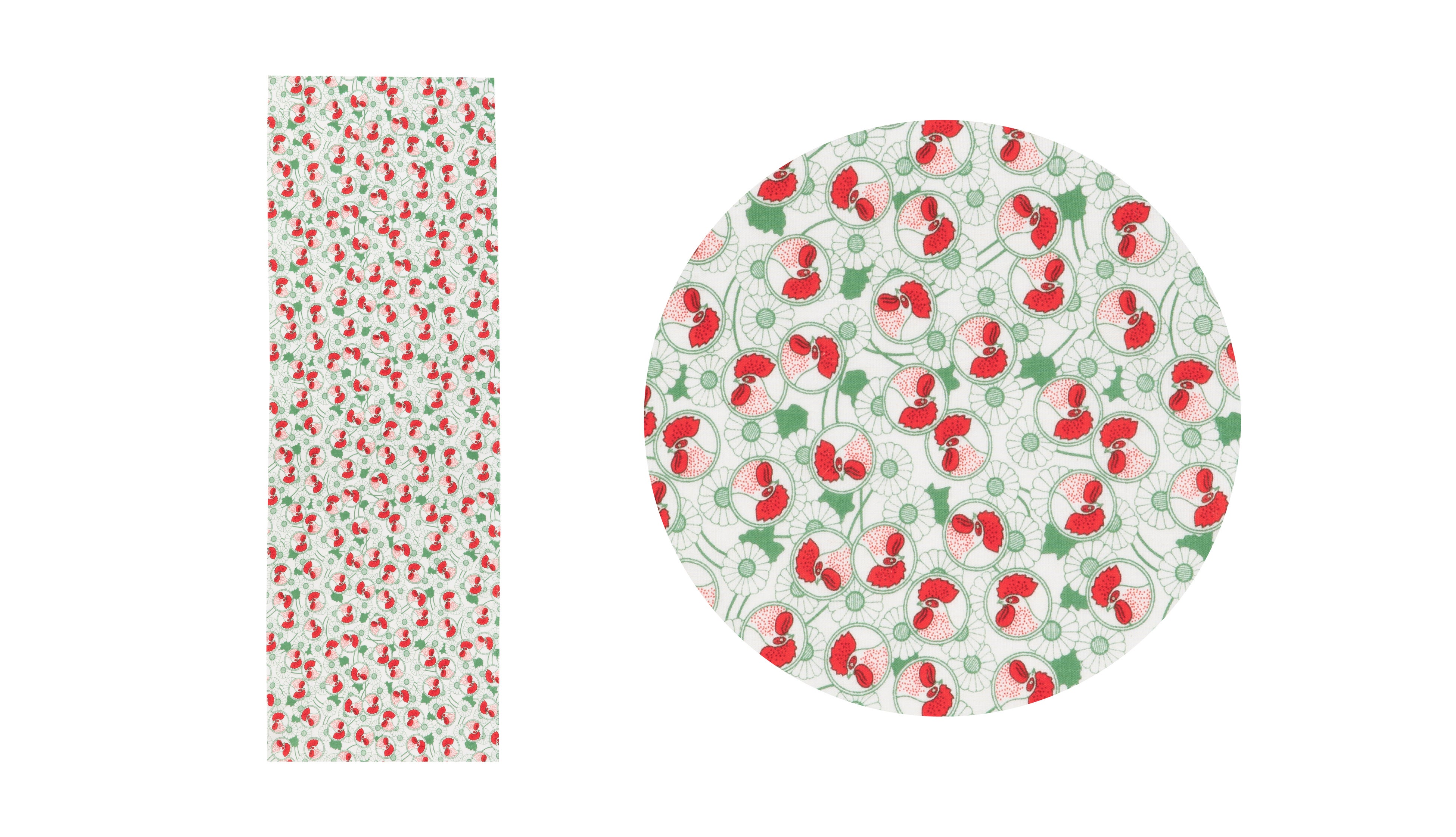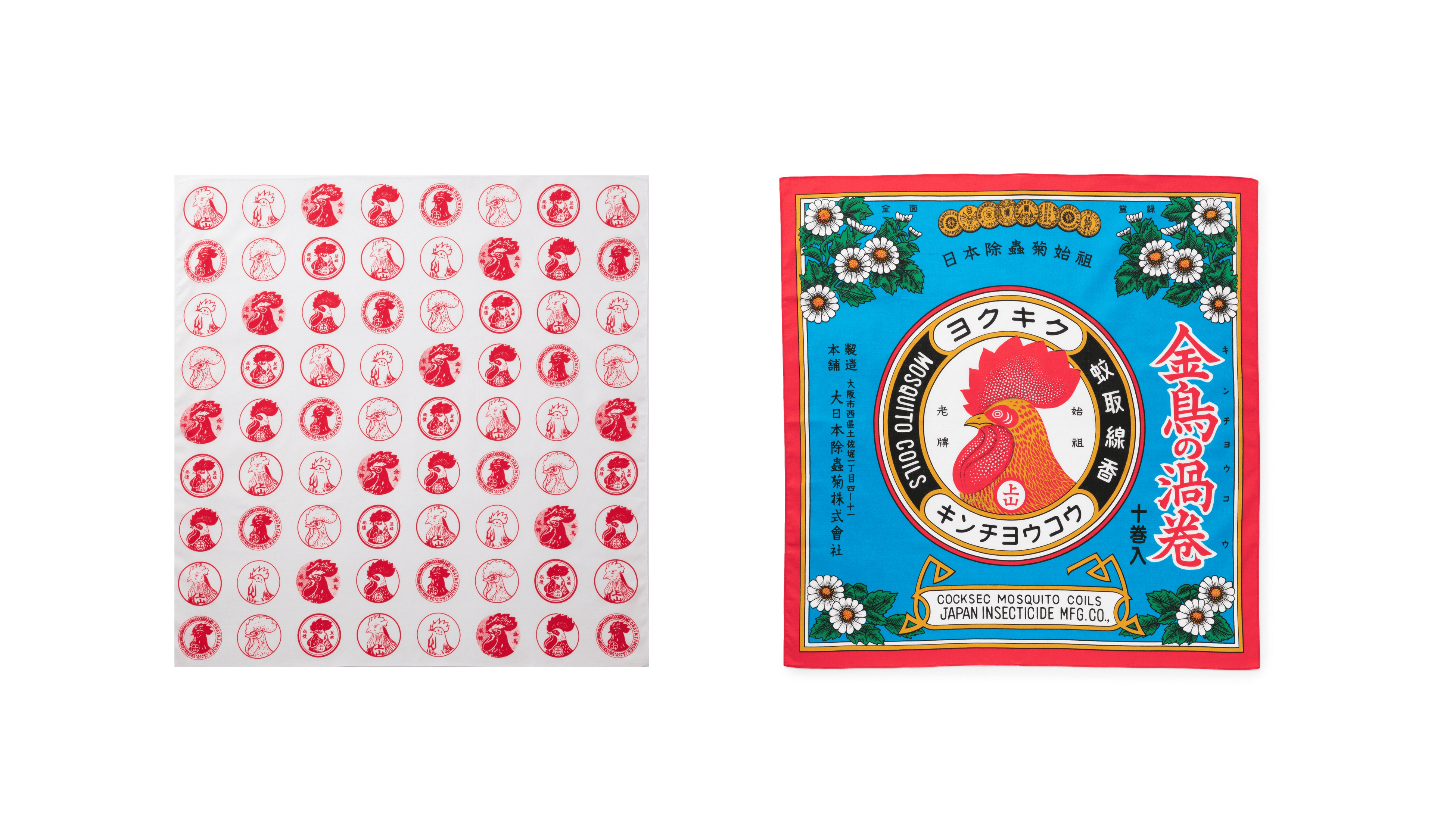 蚊取り線香「金鳥の渦巻」のパッケージに描かれている、鶏と除虫菊を散りばめました。