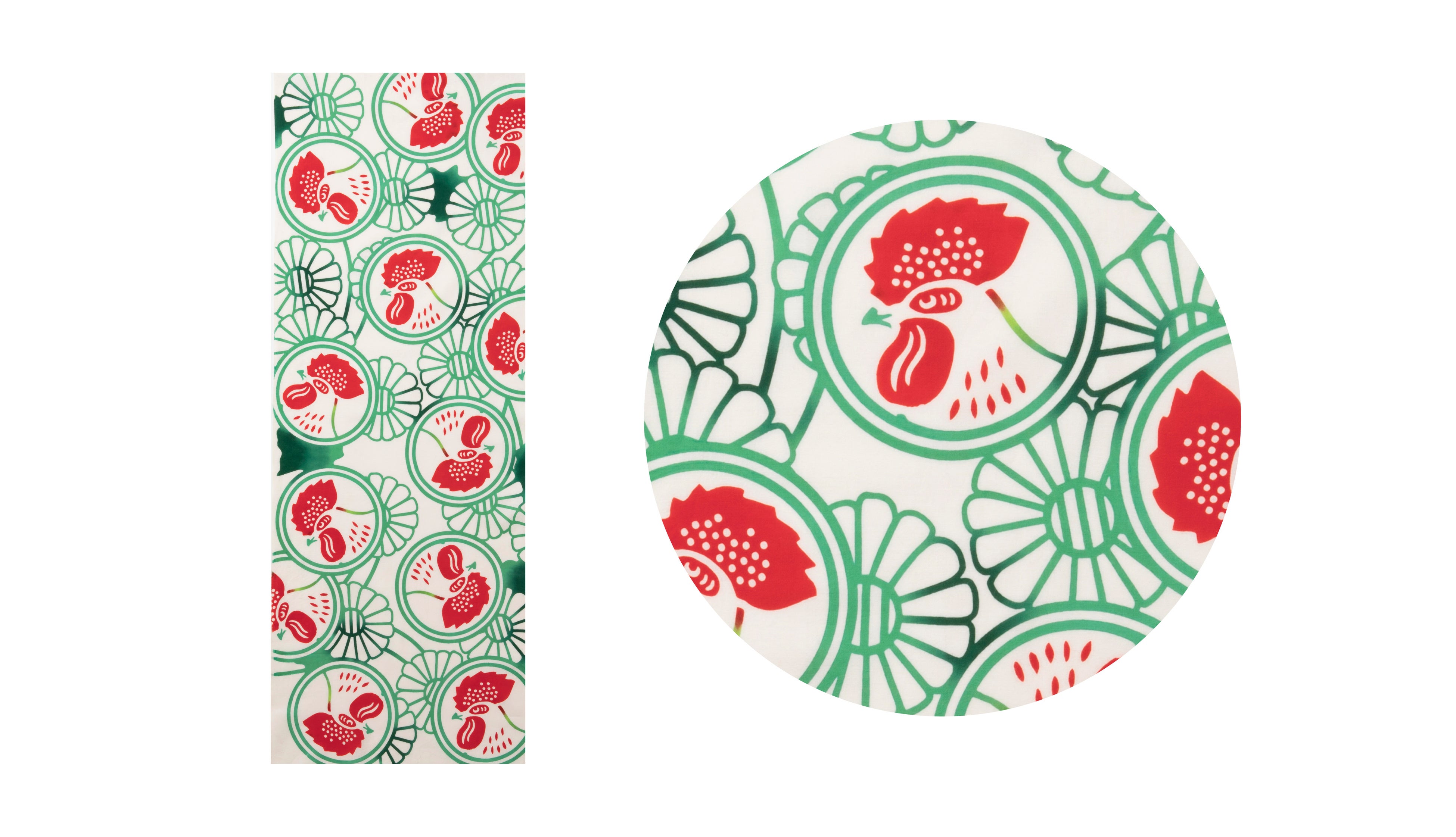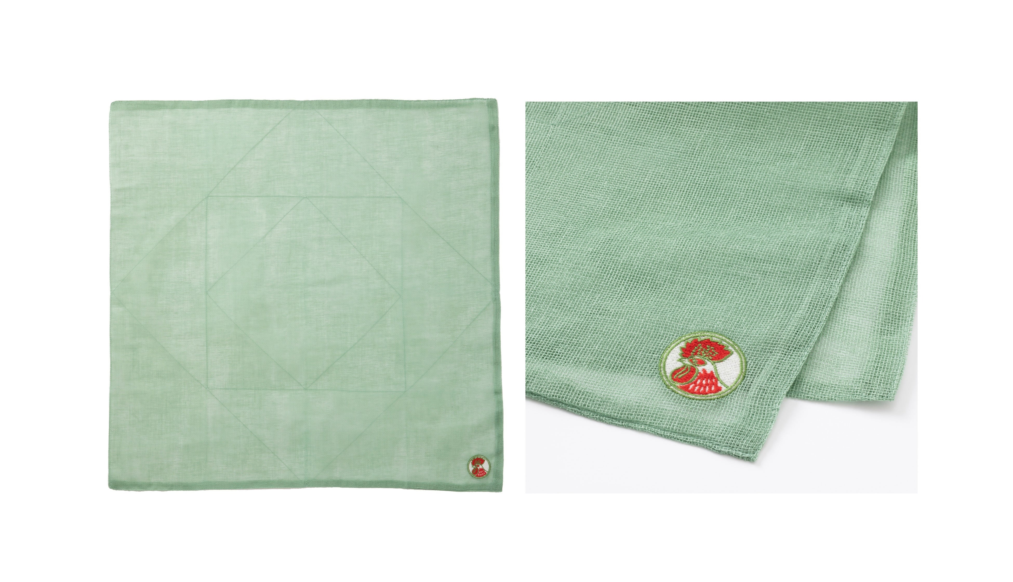 奈良の工芸・かや織を用いた大判ふきん。蚊取り線香をイメージした緑色に、おなじみの鶏を刺繍しました。