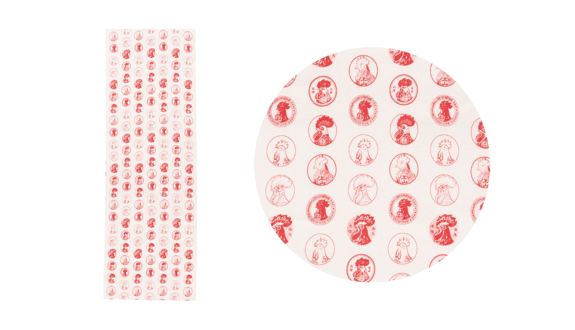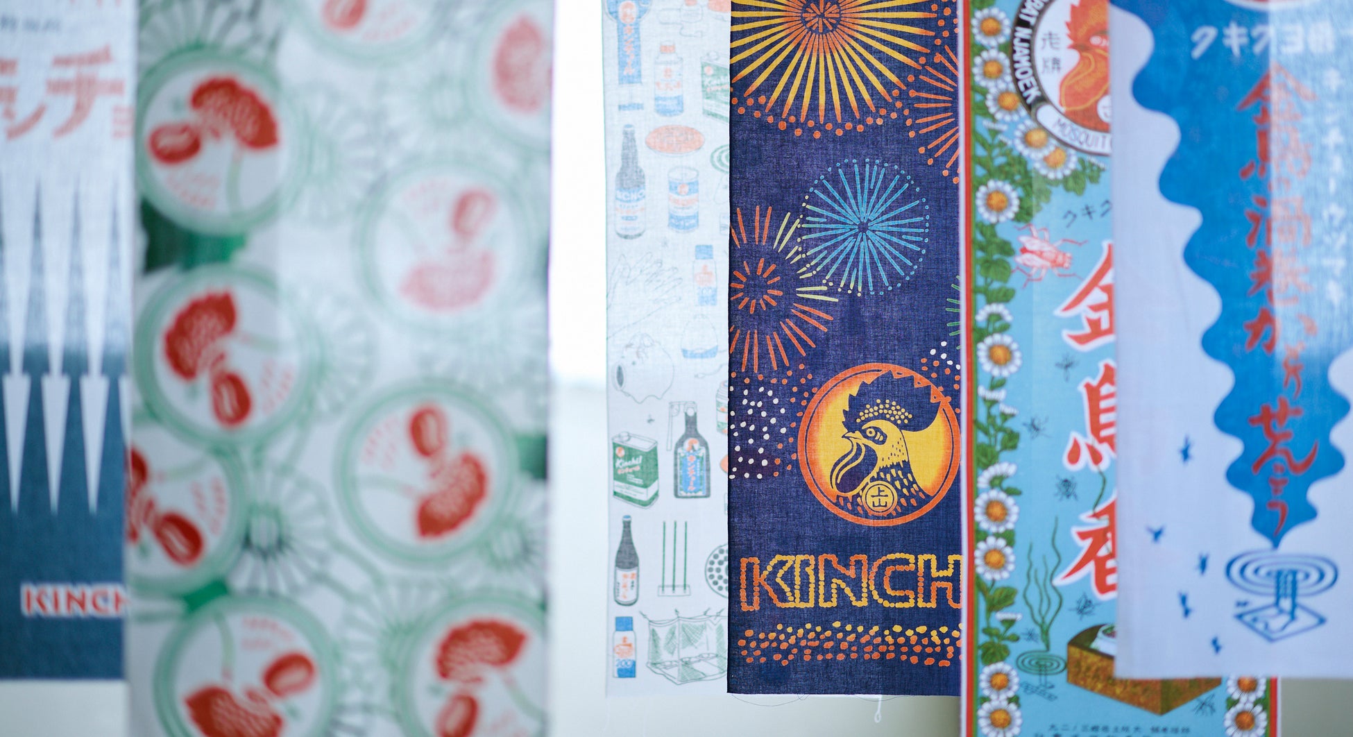 弁当包みや棚の目隠しなど意外と活躍シーンが多い風呂敷。歴代金鳥印紋は、時代とともに変化する歴代鶏マークが楽しめます。また金鳥の渦巻は、品評会のメダルや小さな文字に隠された秘密など、拡大したからこそ見えてくる細部のデザインに注目です。