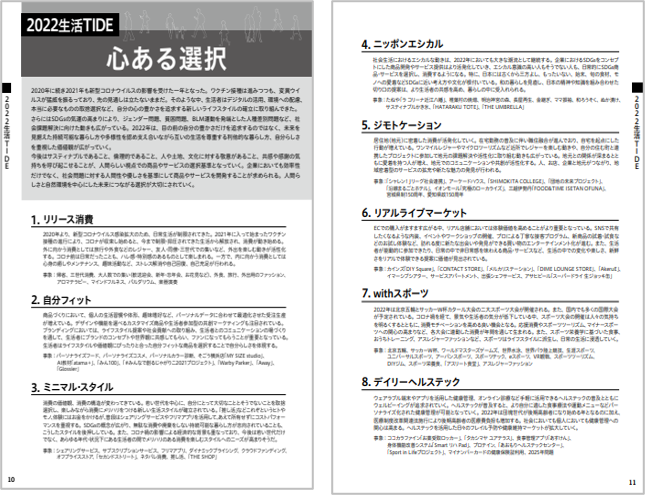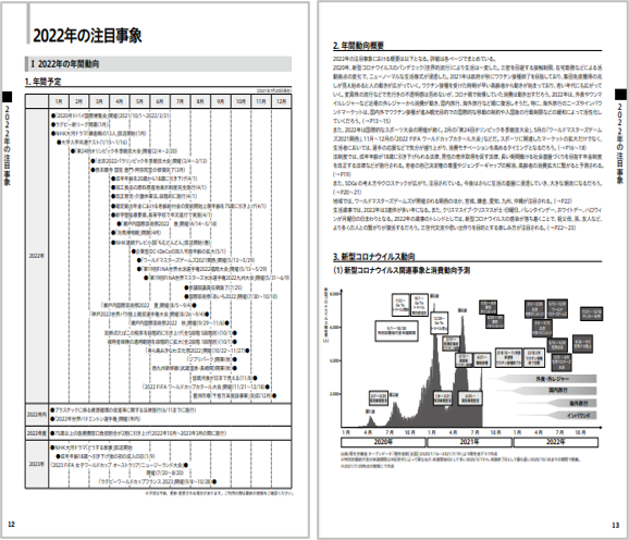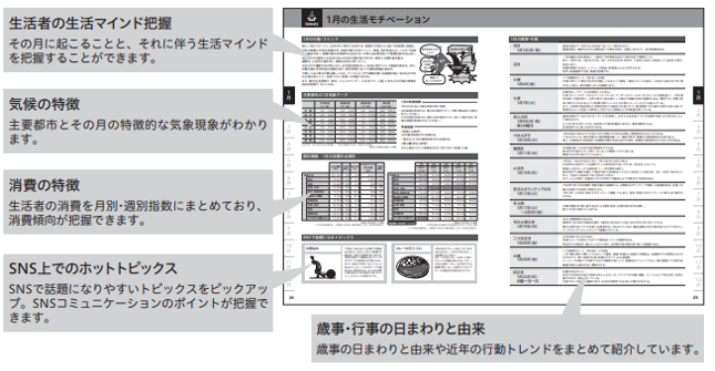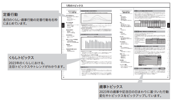その年ならではの販促計画立案に必要な「2023年の生活者価値観の潮流」「2023年注目するべきイベント・事象」に加え、「月ごとの生活者行動の特徴・マインドや注目するべきトピック」が全て1冊にまとまっており、他にはない書籍です。