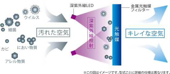 吸い込んだ空気を除菌消臭し、清浄化した空気を放出。深紫外線が直接人体にあたらない、安全性を高めた設計になっています。