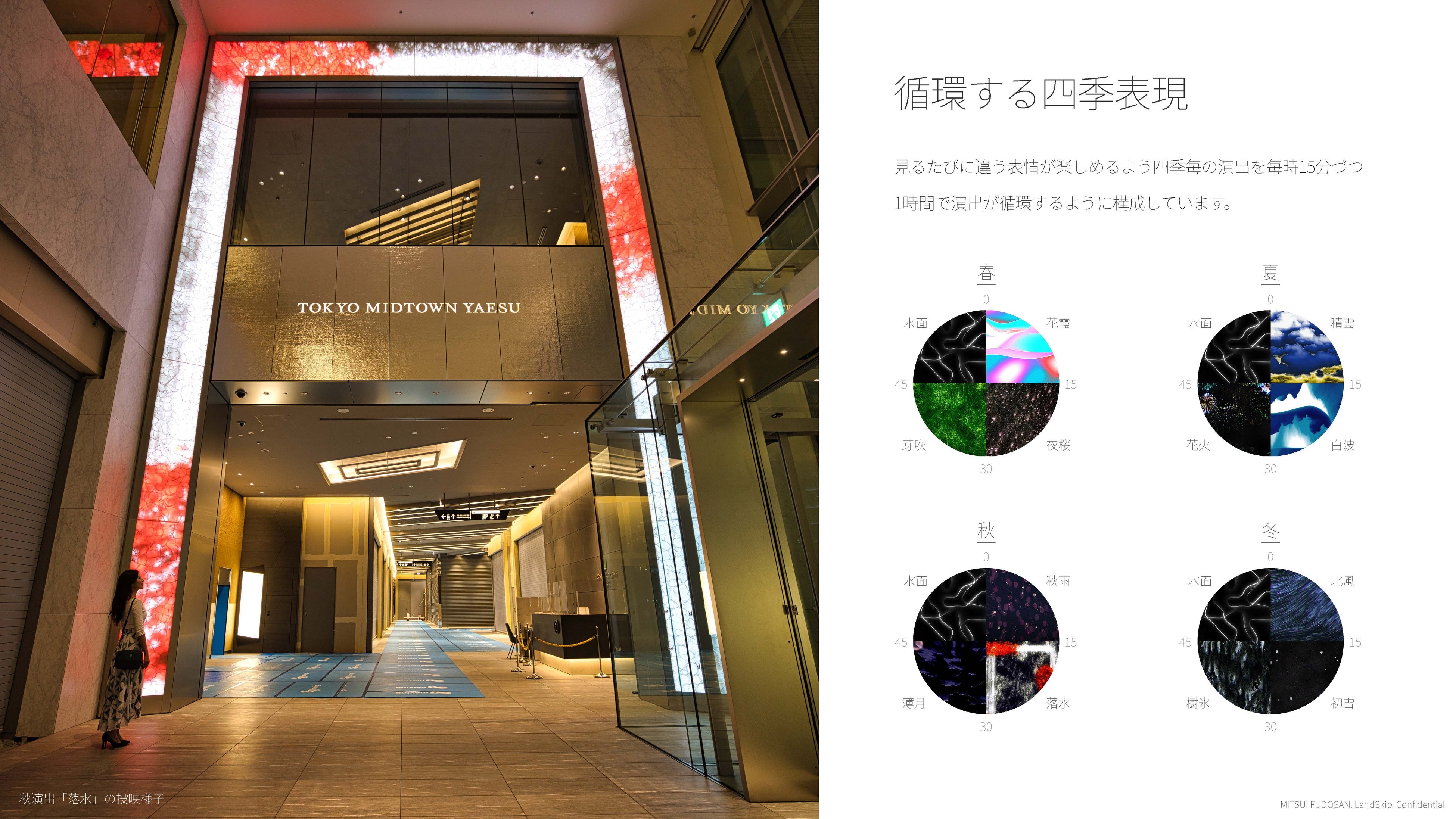 デジタル空間演出を手掛ける株式会社ランドスキップ(代表取締役 下村一樹、以下 LandSkip)は、2023年3月10日にグランドオープンした大規模複合施設「東京ミッドタウン八重洲」(所在:東京都中央区八重洲)の1階エントランスに、LEDビジョンと西陣織パネルを組み合わせたLEDゲートアートを制作いたしました。1階商業ゾーンのエントランスに高さ約11m、幅約7.5mのコの字型のゲートアートを設置。LandSkipのデジタルアートと西陣織ブランドHOSOOのテキスタイルを融合させることで、繊細な織模様や色彩の変化、日本の四季など多様な表情となる空間を演出しています。