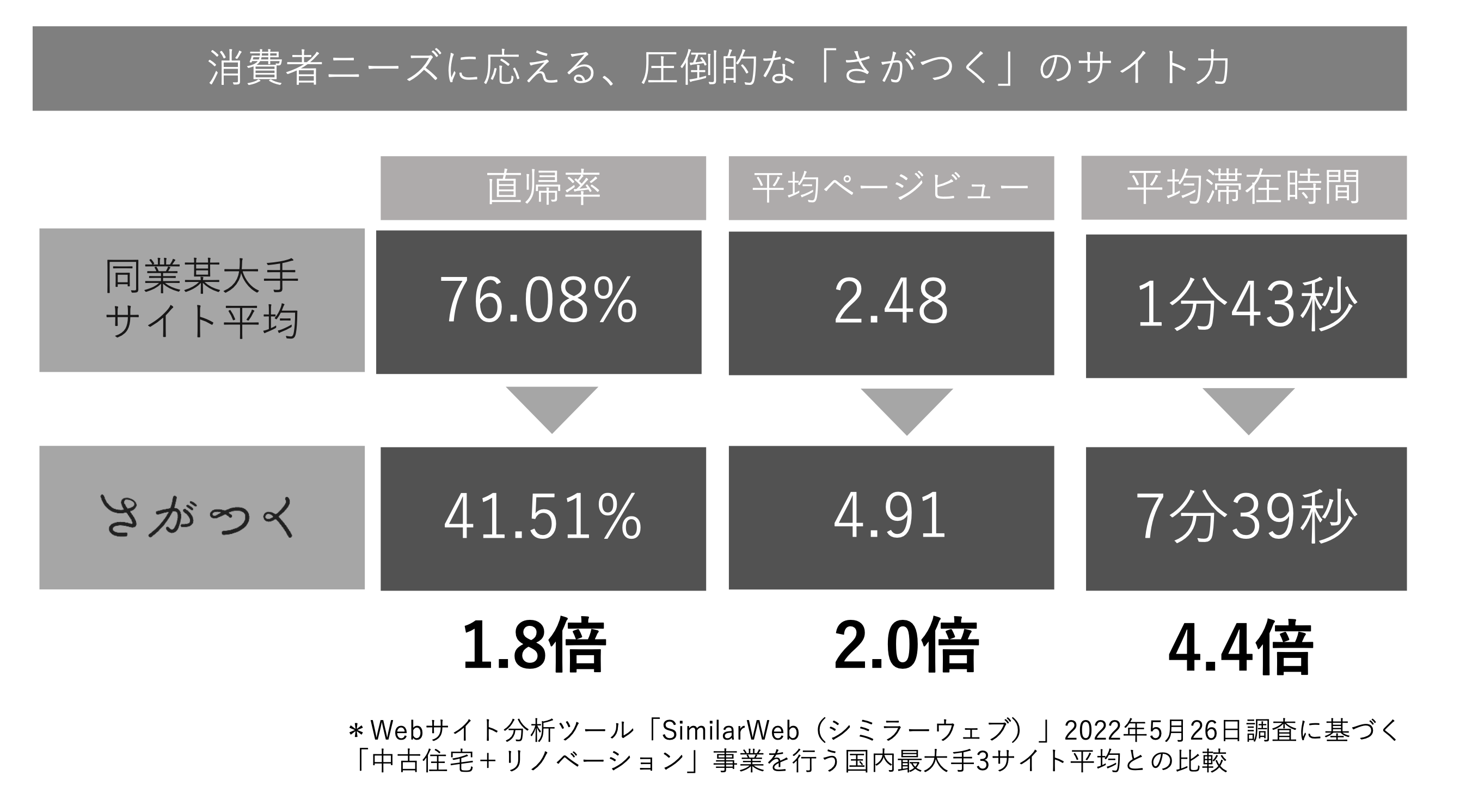 Webサイト分析ツールによる調査では、国内同業大手3社のサイトと比較して、直帰率で1.8倍、ページビューで2倍、サイト滞在時間で4.4倍と言う結果となっており、消費者ニーズにマッチするサイトとしてご利用頂いております。