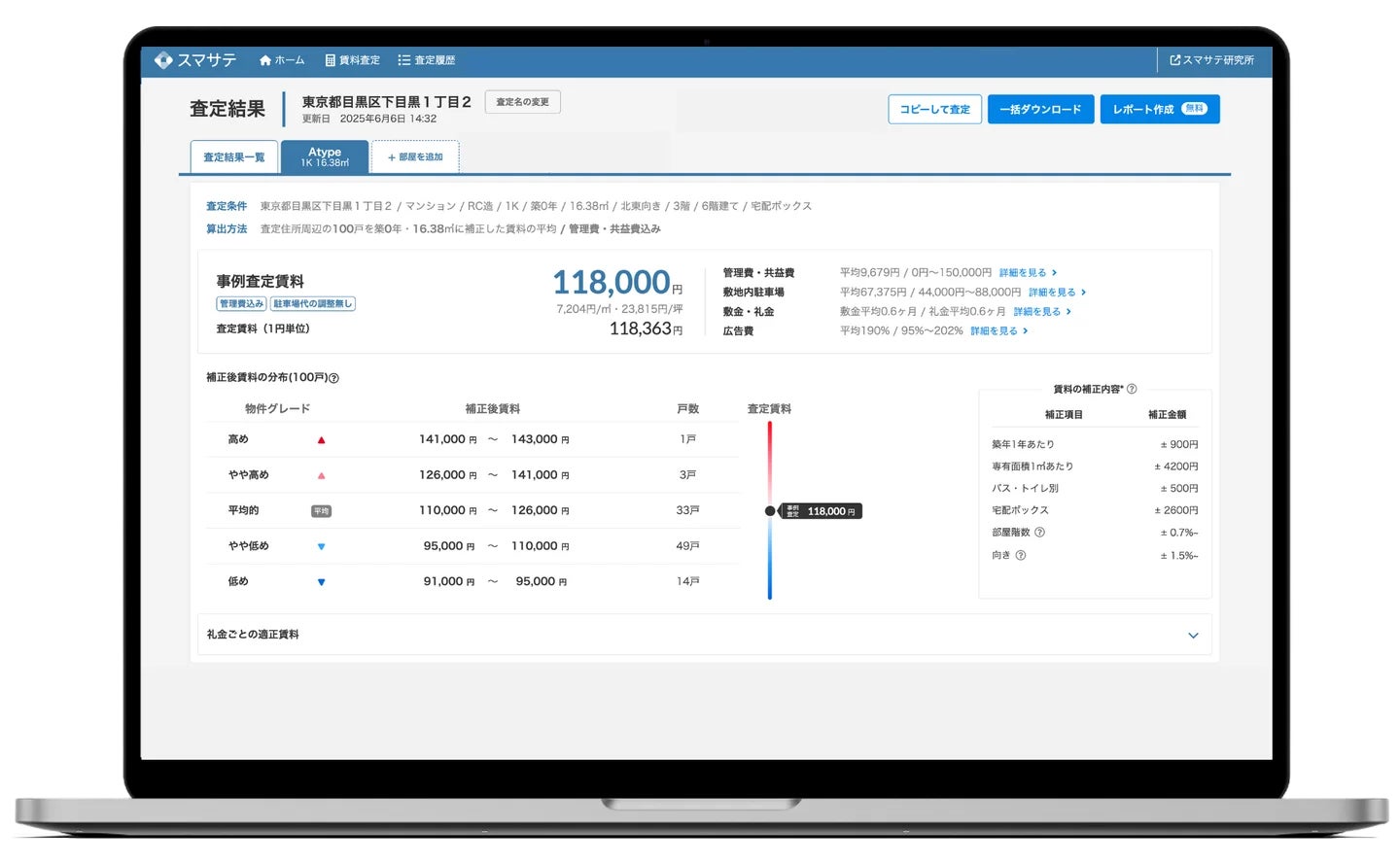 「スマサテ」は簡単な操作で、高精度な賃料査定とその根拠となる周辺事例の抽出、土地活用提案に最適な書類やレポートの作成業務を一瞬で完了できる、AI搭載の賃料査定システムです。導入社数は3900社を超え、無料からでも利用が可能です。