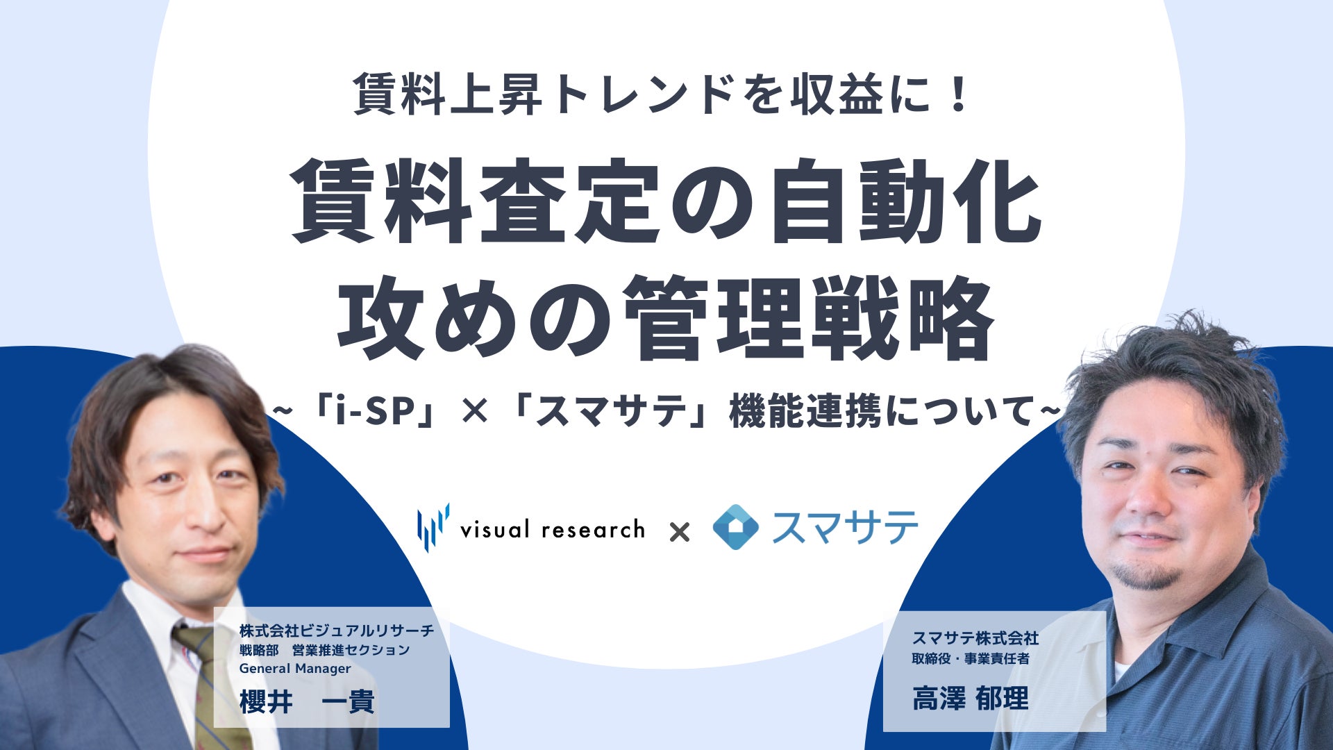 AI賃料査定システムを提供するスマサテ株式会社(本社:東京都品川区、代表取締役社長:山岸 延好)と賃貸管理・不動産仲介業務のDXを推進する株式会社ビジュアルリサーチ(本社:東京都港区、代表取締役社長:小野 貴広)は、2025年11月28日(金)16:00~17:00、賃貸業界向けセミナー『賃料上昇トレンドを収益に!賃料査定の自動化、攻めの管理戦略 ~賃料査定システム「スマサテ」×賃貸管理システム「i-SP」機能連携について~』をオンラインで開催いたします。