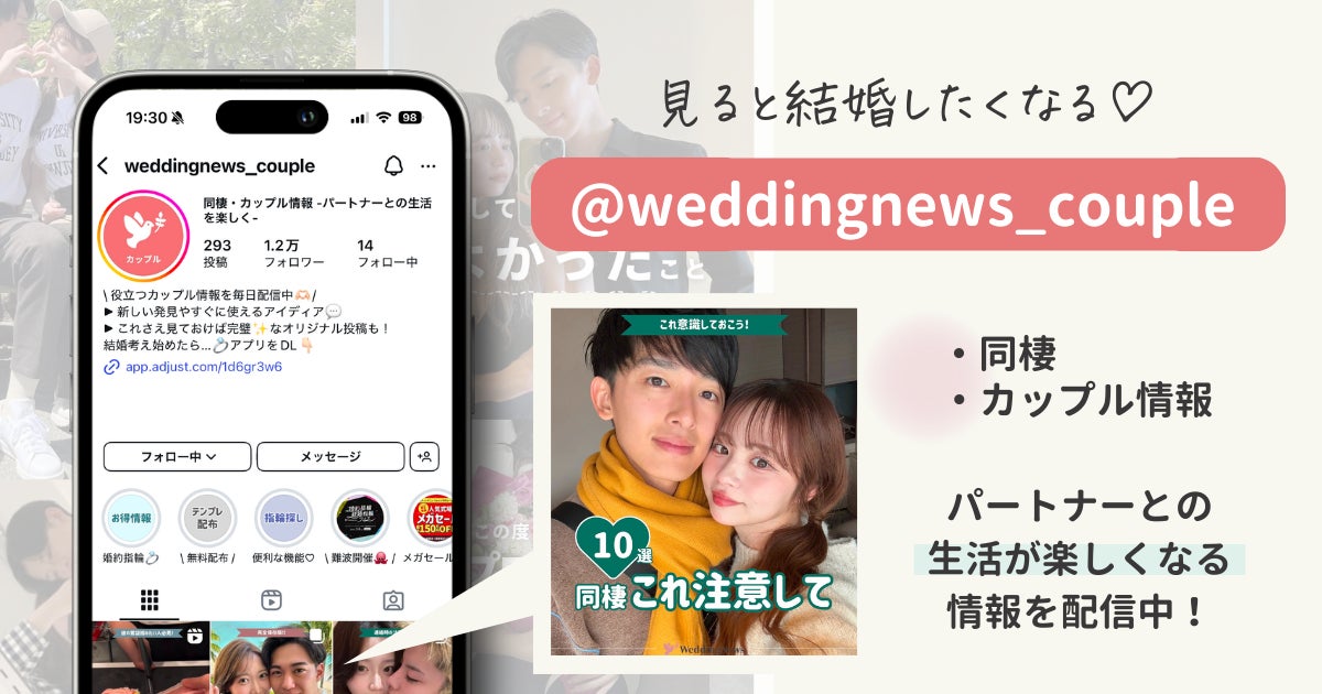昨年のプレスリリース(2023年5月発表)で開始を宣言したカップル向けInstagramアカウント「@weddingnews_couple」は、開設半年で1万フォロワーを突破。このアカウントでは、結婚準備のリアルな悩みやパートナーとの関係を深めるための情報を発信し、共感を呼ぶ投稿が多くのカップルに支持されています。
