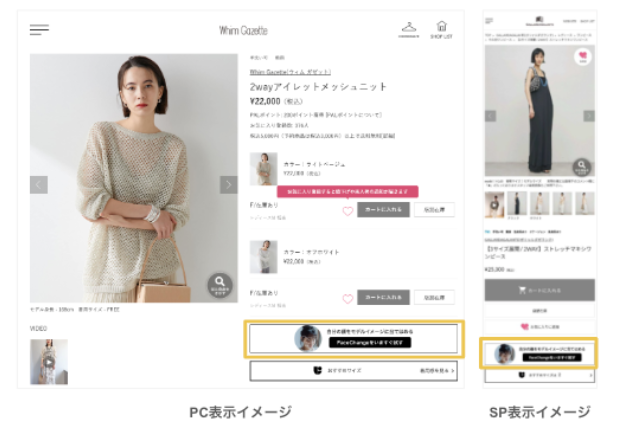 本機能は、商品画像のモデルの顔やユーザーに近い体型のスタッフコーディネートの顔をユーザー自身の顔に差し替えることで、着用イメージの明確化が可能となり、オンラインでの商品購入を促進します。