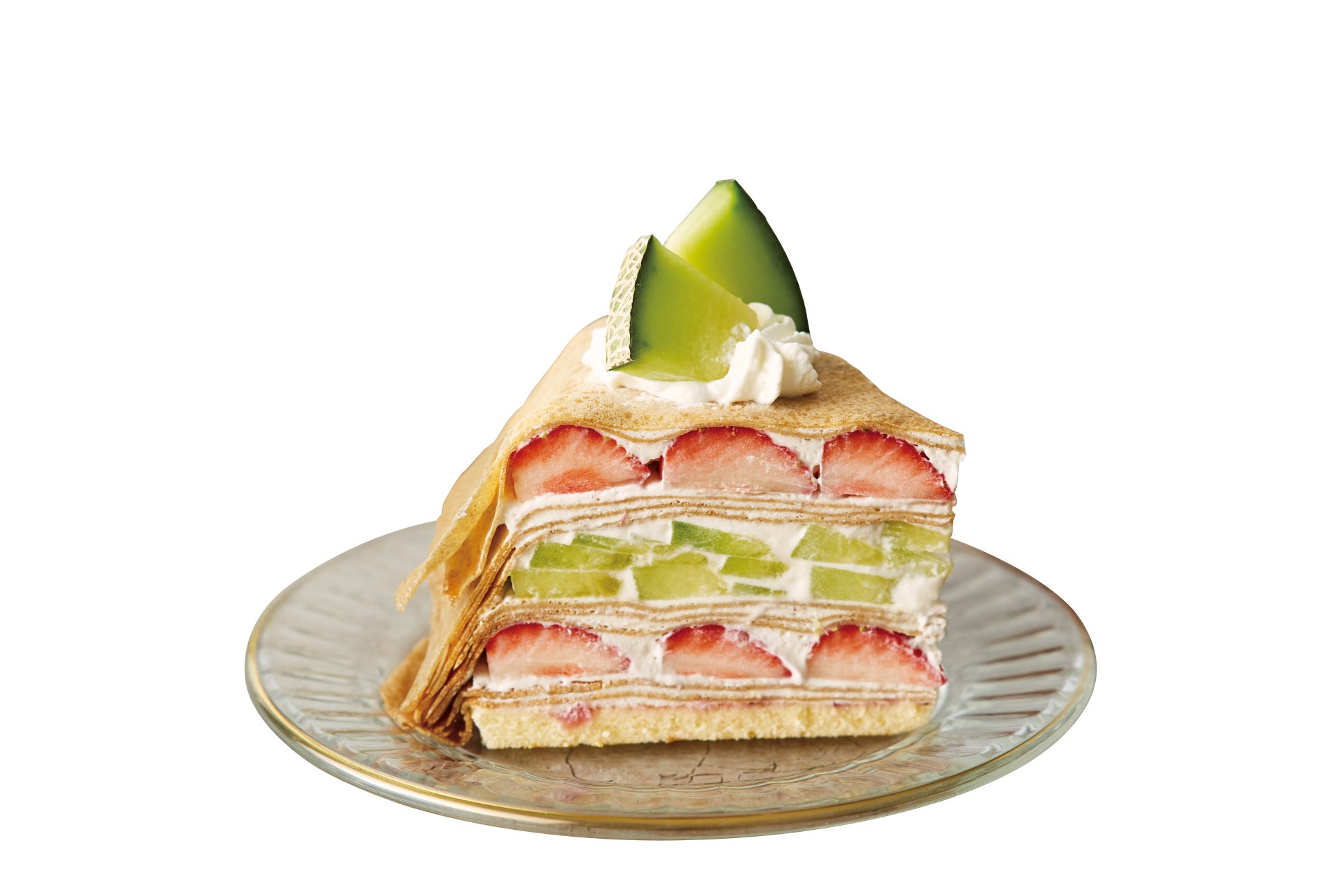 苺と鉾田産メロンを贅沢に使用し、ホワイトラム入りのホイップクリームと店内で焼き上げたクレープ生地を丁寧に重ねました。