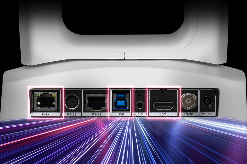 HDMI/USB/IP/3G-SDIの4系統の出力端子を搭載。また、PoE+給電にも対応しているため、配線を簡素化できるだけでなく、設置場所や周辺機器との組み合わせに応じて、最適な接続方法をお選びいただけます。