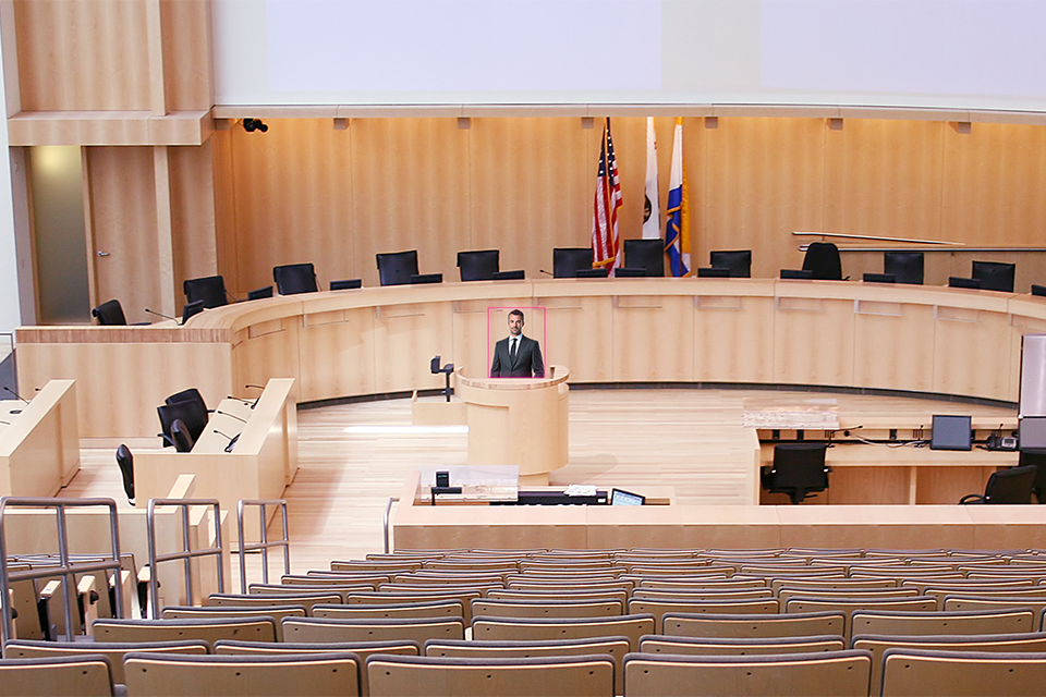 シーリングマイクなどの外部マイク*とAVerのリモートカメラを連動**させることにより、発言中の人物にカメラを自動的にパン・チルト・ズームして撮影を行うことができます。