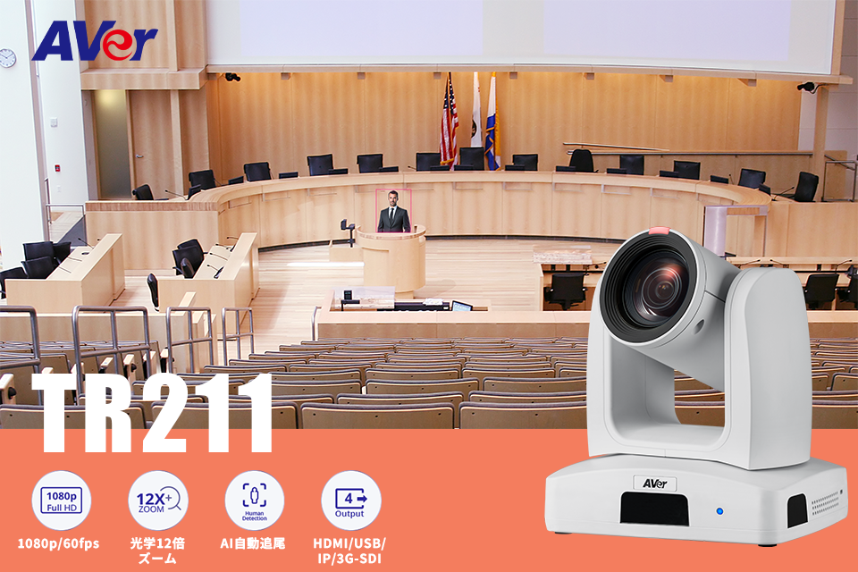 AVerのAI自動追尾リモートカメラのラインナップに新たに加わった「TR211」は、フルHD 1080p/60fpsの高解像度、光学12倍ズーム、そしてAI自動追尾機能を搭載した、放送から動画配信、動画収録など幅広いシーンで活躍するリモートカメラです。