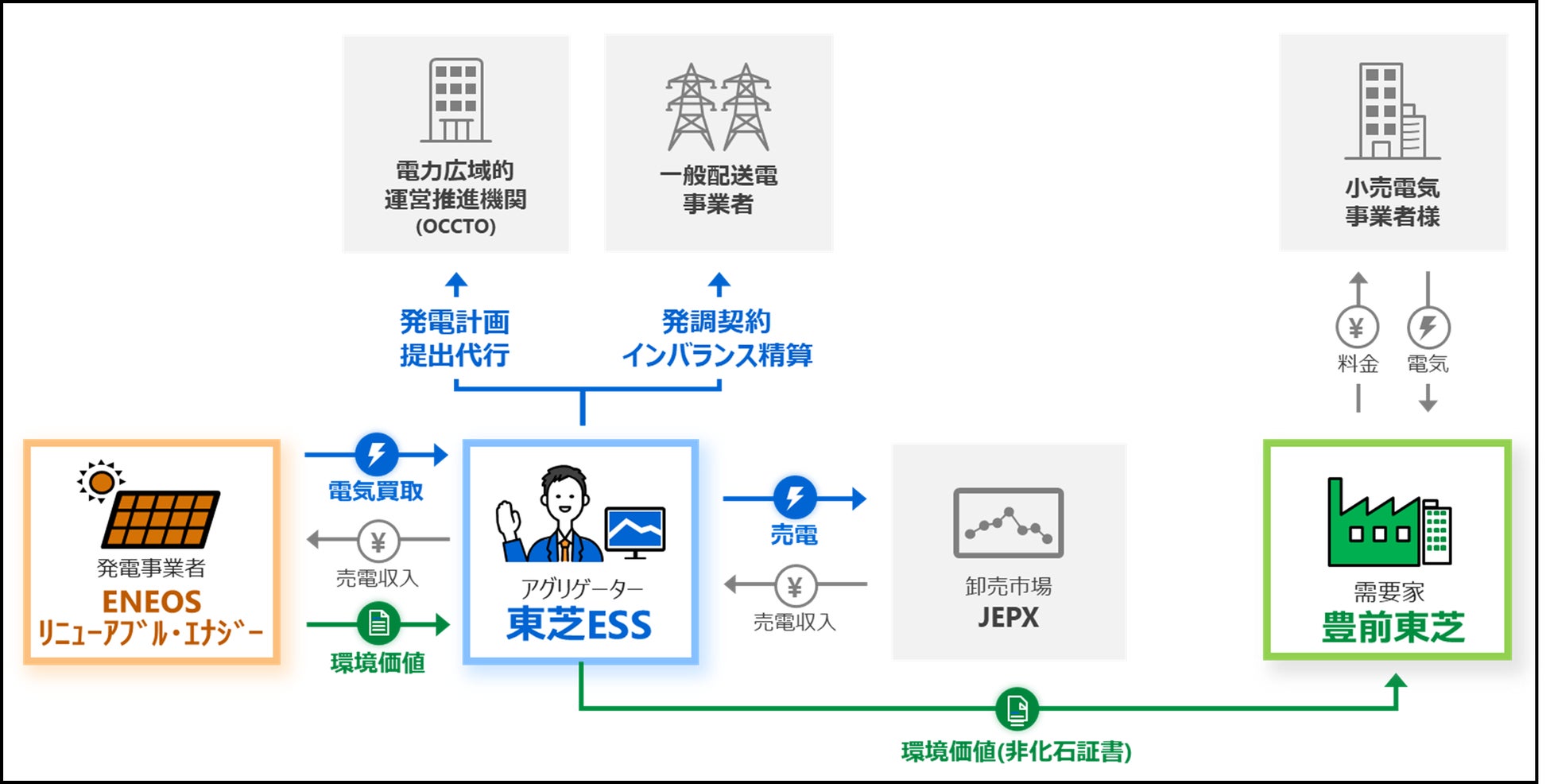 ENEOSリニューアブル・エナジー株式会社(本社:東京都港区、代表取締役社長:竹内一弘、以下「ERE」)と豊前東芝エレクトロニクス株式会社(本社:福岡県豊前市、代表取締役社長:広津明彦、以下「豊前東芝」)および東芝エネルギーシステムズ株式会社(本社:神奈川県川崎市、代表取締役社長:島田太郎、以下「東芝ESS」)は、豊前東芝向け環境価値の供給に関して、コーポレートPPA*¹を締結しました。