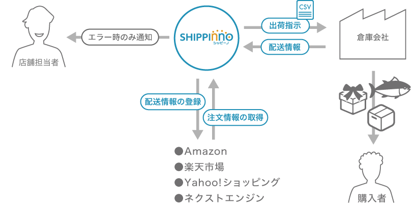 シッピーノは国内大手ECモールやカートシステムと倉庫サービスを繋ぐことで、出荷に関わる一連の業務を完全に自動化できるサービスです。