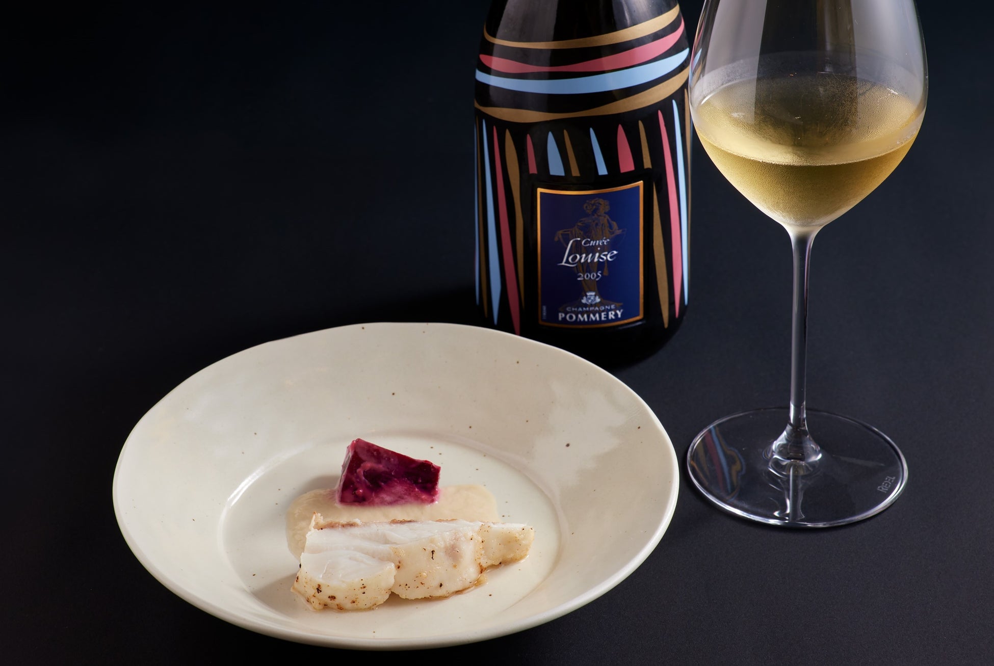(4品目)ビーツのソースは勇気がある酸味を感じました。料理単体と考えるとバランスをとるために味わいが丸くなることが多いのですが、この料理は塩味と酸味があってシャンパーニュとマッチングしていました。シャンパーニュが持ち合わせていない塩味を加えたことがとてもよい効果を生んでいると思います。