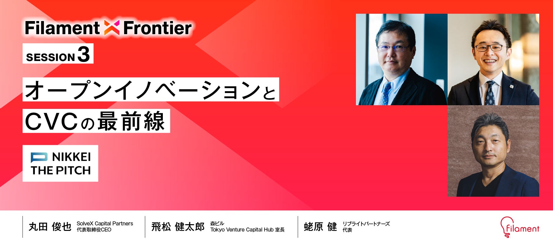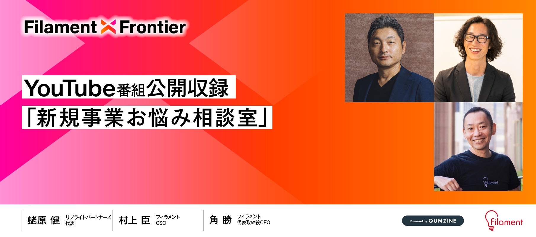 フィラメントの公式YouTubeチャンネル企画「新規事業お悩み相談室」では、実際に新規事業に携わる方々からの質問やお悩みに、村上臣さん(新規事業のスペシャリスト)、蛯原健さん(リブライトパートナーズ代表)、角勝(フィラメントCEO)がズバッと回答する番組の公開収録も「Filament X Frontier」で行われます。