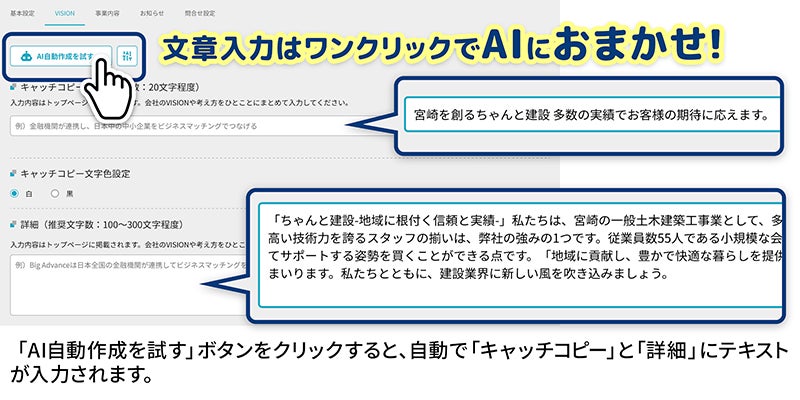 機能についてアップデートを適宜行っており、2023年5月にはChatGPTを活用したホームページ作成のサポート機能を追加し、より効率的に自社の強み等を言語化することが可能となりました。