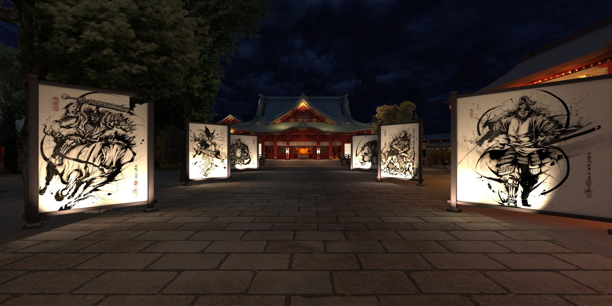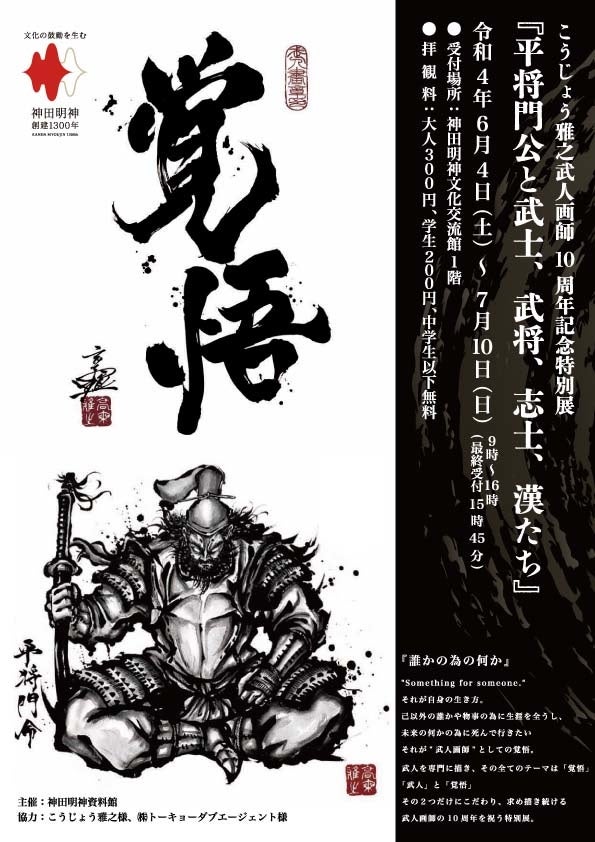 武人とは戦う者ではなく“覚悟を持つ者”として、『覚悟』をテーマに戦国武将を中心に歴戦の武人を墨を使って描く武人画専門絵師「こうじょう雅之」。武人画師としての10周年を祝い、神田明神に所蔵するこうじょう雅之の作品、平将門公を中心とした武士、武将、志士、漢に関する資料を展示し、こうじょう雅之がライフワークとする「武人」と「覚悟」の世界を展開する特別展を開催いたします。又、神田明神CG空間にてこうじょう雅之展示作品やライブアート映像が楽しめるイベントも同時開催いたします。