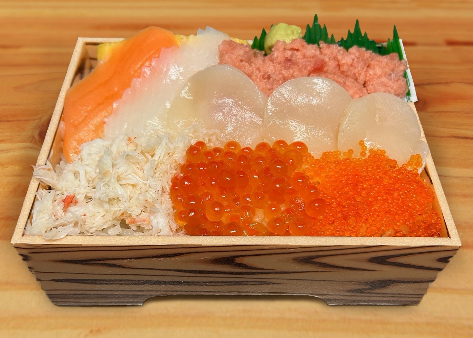 いくら、サーモン、ホタテ貝柱など、人気のネタをボリュームたっぷりに盛り合わせました。