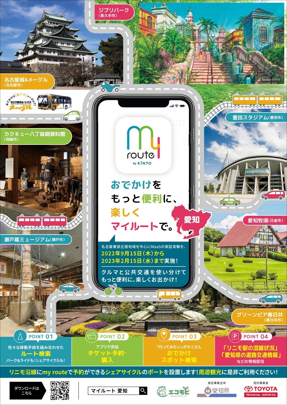 トヨタファイナンシャルサービス株式会社(本社:愛知県名古屋市、代表取締役社長:頃末広義、以下、TFS)は、昨年に続いて愛知県様が実施する「マルチモーダルサービス導入実証事業」を受託し、トヨタファイナンス株式会社(本社:愛知県名古屋市、代表取締役社長:西 利之、以下、TFC)と共同して、名古屋東部丘陵地域を中心にTFSが全国展開するスマートフォン向けマルチモーダルモビリティサービスアプリ「my route(マイルート)」を活用した実証実験を9月15日より開始します。