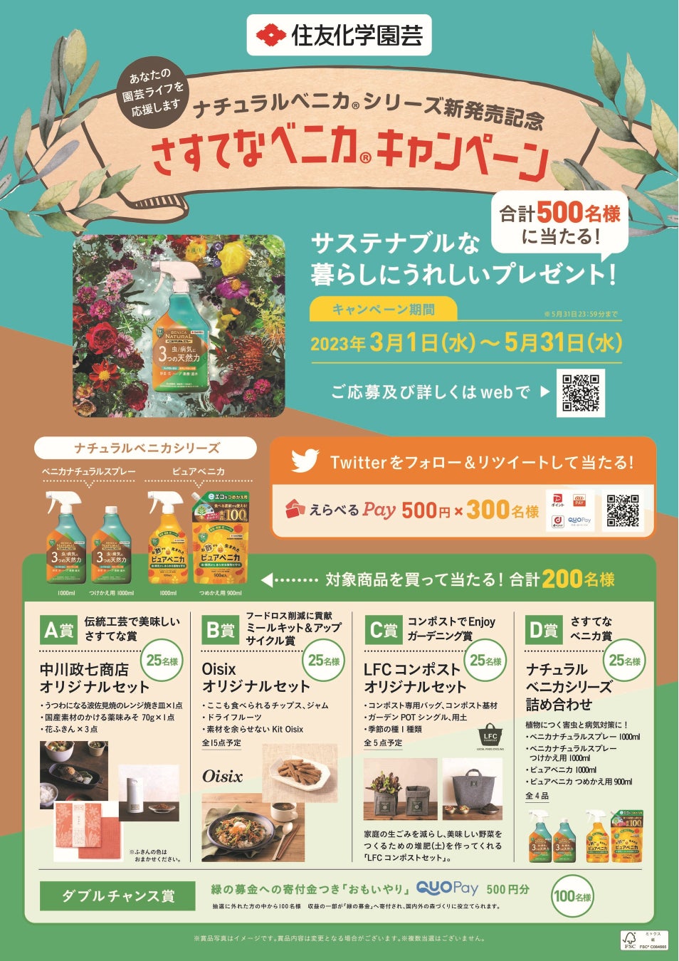 3月1日(水)から開始する「さすてなベニカ®キャンペーン」では、ナチュラルベニカ®シリーズの対象商品の購入でサステナブルな暮らしにうれしいプレゼントが当たるコースと、住友化学園芸のTwitter公式アカウントのフォロー&リツイートでえらべるPay500円分が当たるコースを同時に実施します。2コースあわせての応募も可能です。