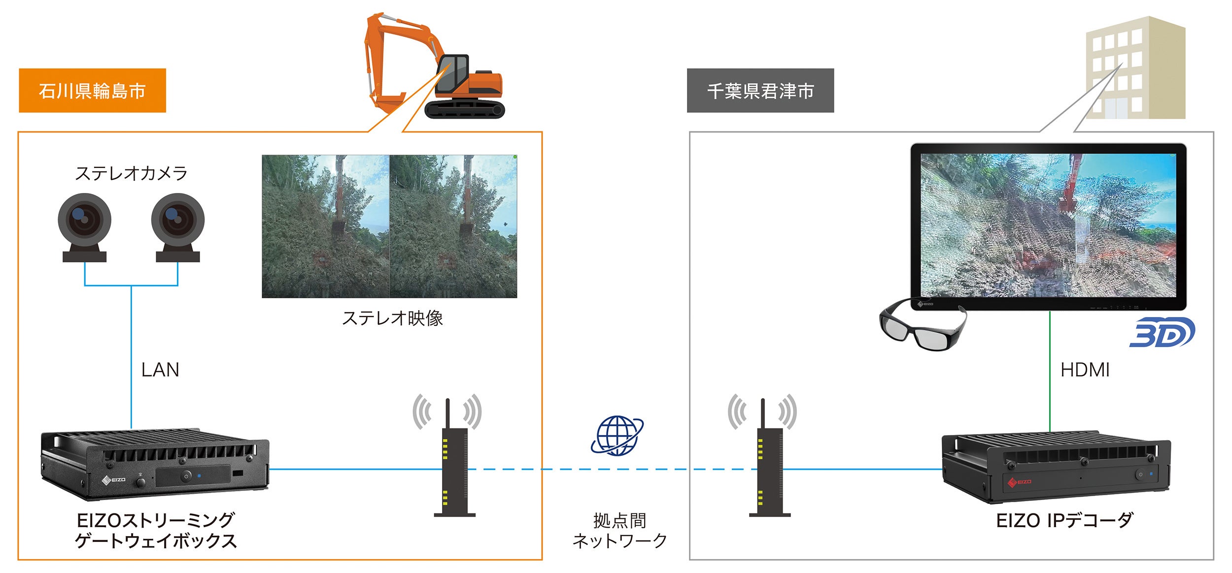 当社のストリーミングゲートウェイ技術により、石川県と千葉県間の超長距離でも同期の取れたステレオ映像を安定伝送。遠隔から安全な現場実証を実現しました。