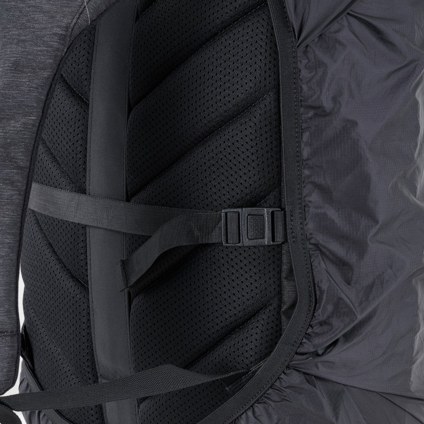 背面にはバックパックにしっかりとフィットさせるコンプレッションストラップを装備。風によるバタつきを防ぎ、安定した装着感を実現します。