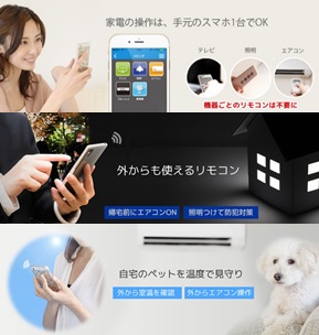 外出先から自宅の家電のリモコン操作が可能です。帰宅時にあらかじめエアコンや照明をつけて、部屋を快適な状態にしておいたり、消し忘れたテレビやエアコンなどを外出先から消したりすることもできます。
