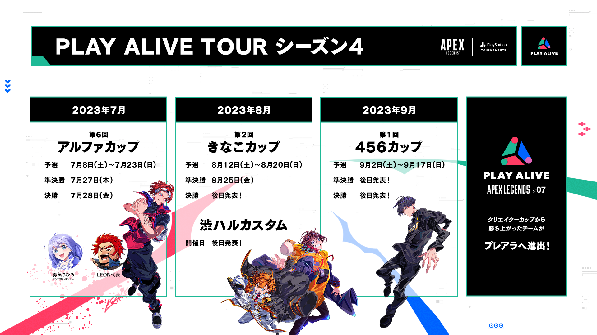 「プレアラツアー」とは、人気クリエイターのAlphaAzurさん、渋谷ハルさん、きなこさん、456のへしこさん、ゆきおさん、L1ngさんがホストするPlayStation®ユーザー参加型イベント「アルファカップ」、「渋ハルカスタム」、「きなこカップ」、「456カップ」と連動して行われ、各イベントの上位入賞チームが10月に行われる人気クリエイターが集結する「PLAY ALIVE : Apex Legends Vol.7」への出場権を獲得できます。