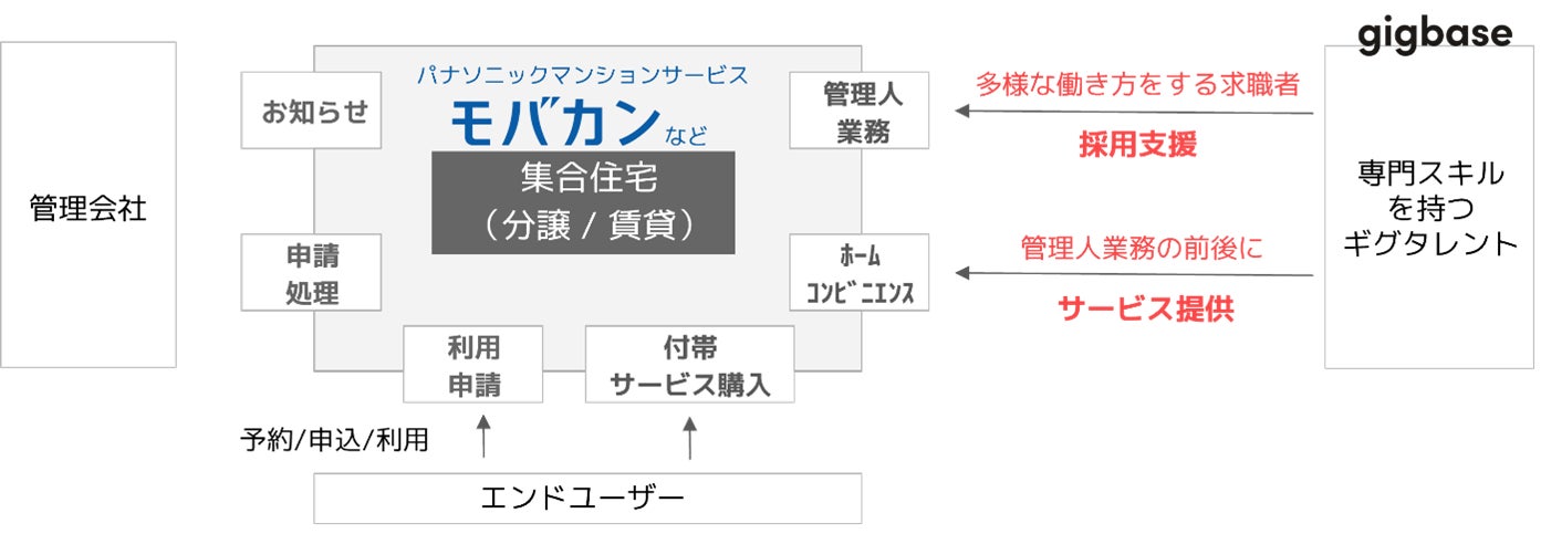 1つ目は、マンションの管理人業務のDX化を実現する「クラウド管理人」です。当社の多様な働き方を望むギグタレントのデータベースと、不動産業界での約1500社との取引ノウハウに、マンション管理IoT化サービス「モバカン」などのパナソニックマンションサービスと組み合わせることで、 管理人業務のDX化を実現。マンション管理会社・組合の人手不足解消を図ります。