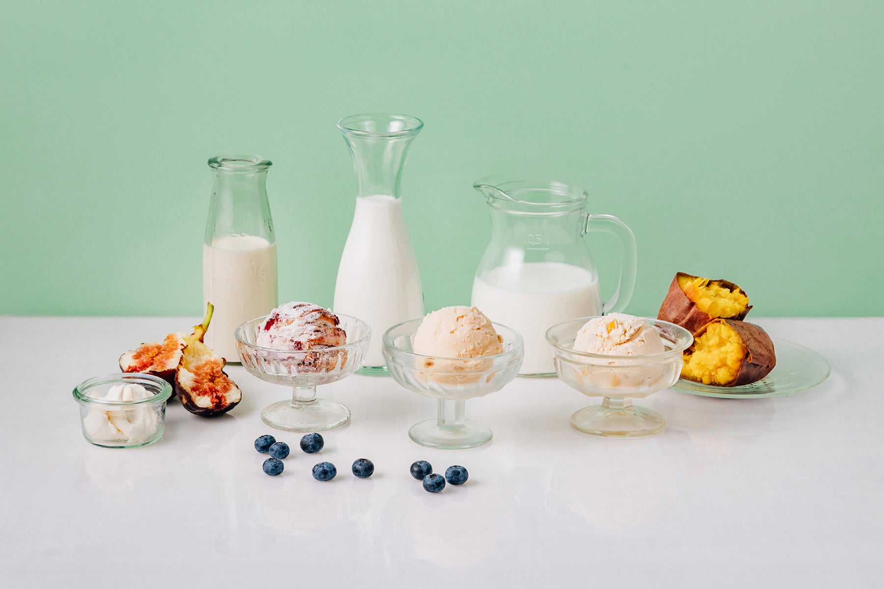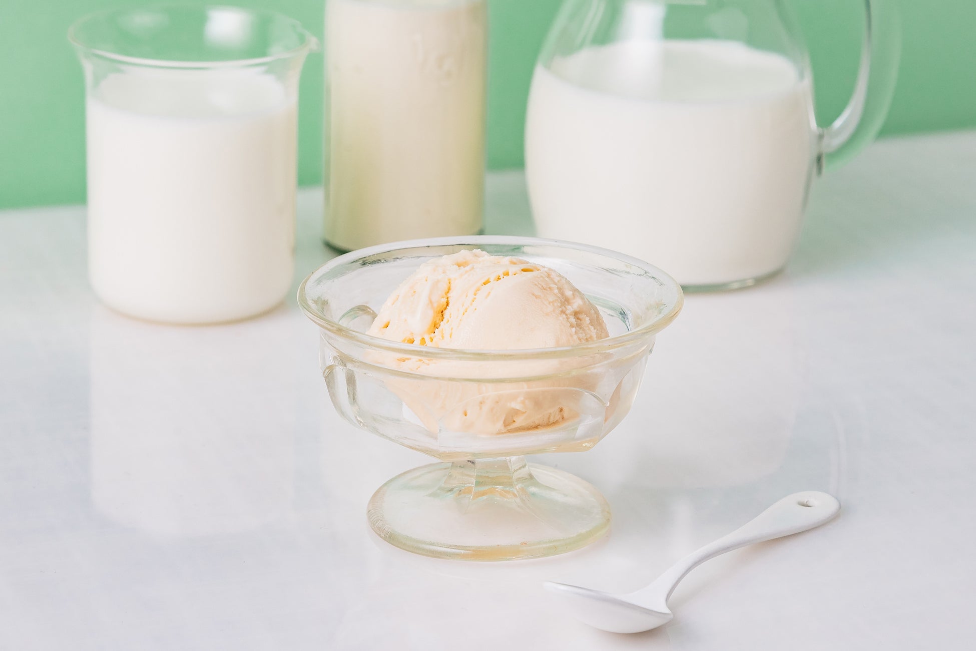 飼養頭数で日本一を誇る、岡山県の蒜山から届くフレッシュなジャージー牛乳でピュアなミルクアイスクリームをお作りしました。