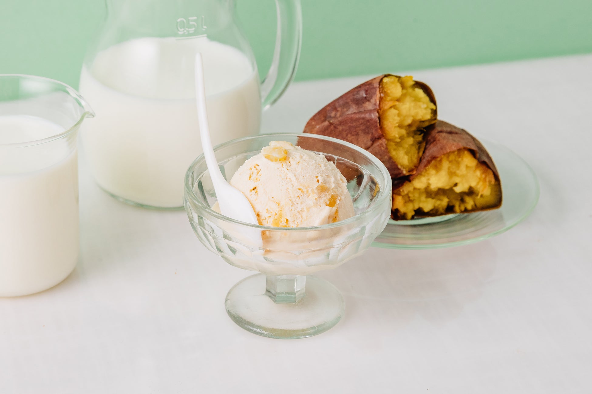 「焼き芋」「芋ペースト」「丸干し芋」という三種類の食材と、北海道産牛乳&生クリームをたっぷり使った濃厚なミルクアイスを合わせることで、「史上最高のお芋のアイスクリーム!」と断言したくなるほどの自信作ができあがりました。